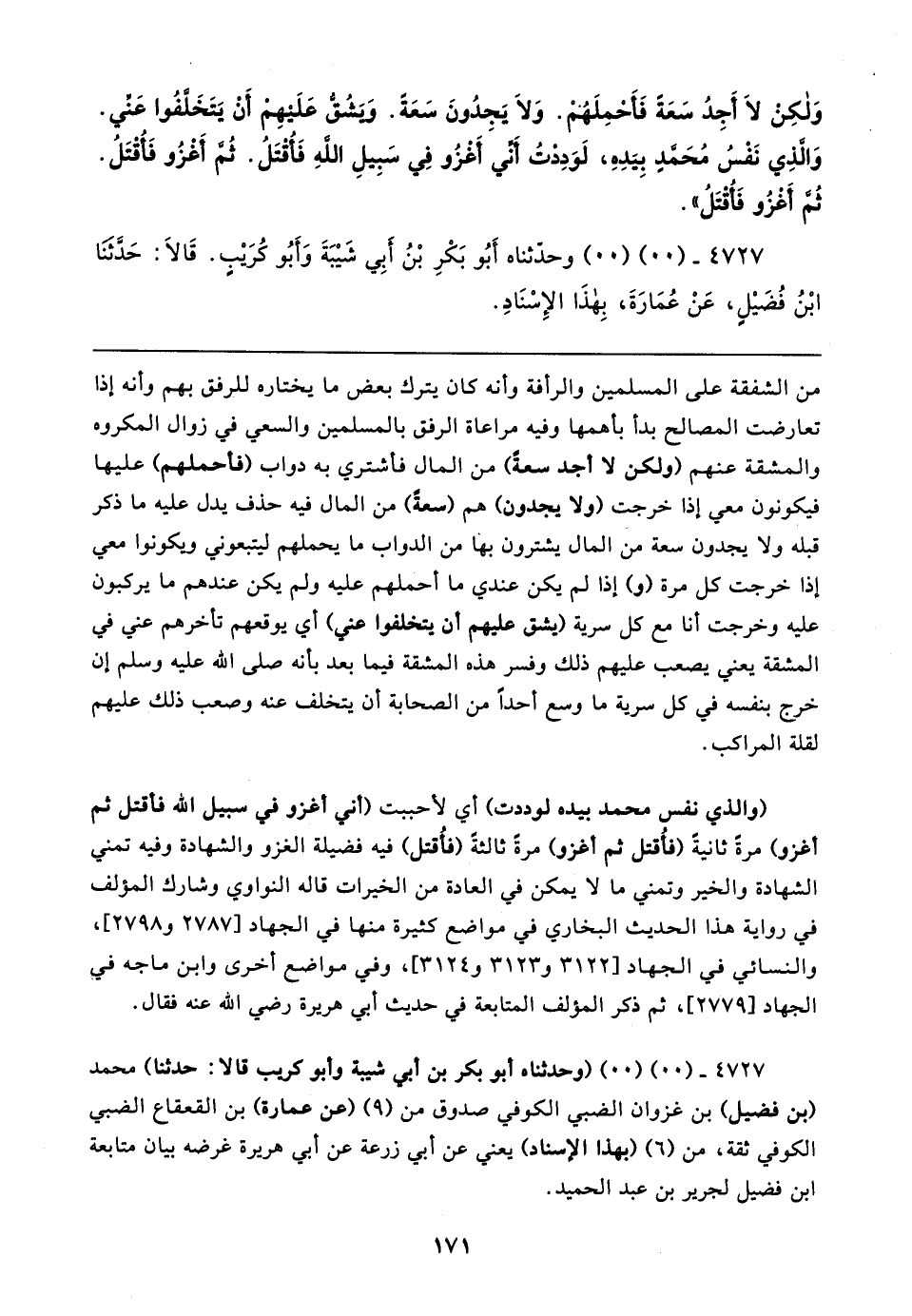 وَلكِنْ لَا أَجِدُ سَعَةً فَأحْمِلَهُمْ. وَلَا يَجِدُونَ سَعَةً. وَيَشُقُّ عَلَيهِم أَنْ يَتَخَلَّفُوا عَنِّي. وَالَّذِي نَفْسُ مُحَمَّدٍ بِيَدِهِ، لَوَدِدْتُ أَنِّي أغْزُو فِي سَبِيلِ الله فَأقْتَلُ. ثُمَّ أَغْزُو فَأُقْتَلُ. ثُمَّ أَغْزُو فَأُقْتَلُ".