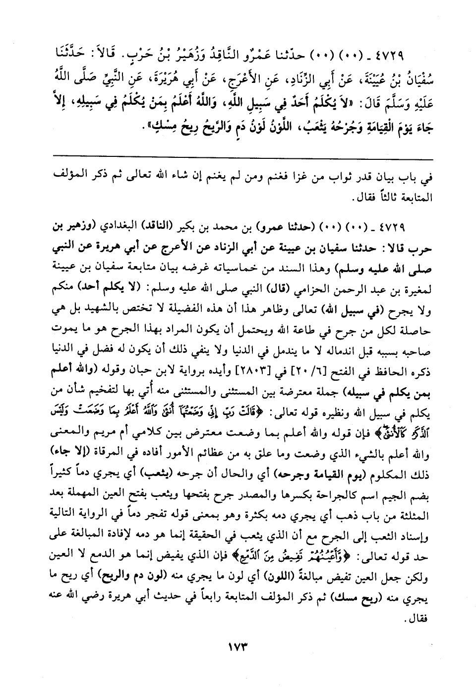 ٤٧٢٩ - (٠٠) (٠٠) حدثنا عمرٌو النَّاقِدُ وَزُهيرُ بْنُ حربٍ. قَالا: حَدَّثَنَا سُفْيَانُ بْنُ عُيَينَةَ، عَنْ أَبِي الزنَادِ، عَنِ الأعرَج، عَنْ أَبِي هُرَيرَةَ، عَنِ النَّبِي صَلَّى اللهُ عَلَيهِ وَسَلمَ قَال: "لَا يُكلَمُ أَحَدٌ فِي سَبِيلِ الله، وَاللهُ أَعلَمُ بِمَن يُكْلَمُ فِي سَبِيلِهِ، إلا جَاءَ يَوْمَ القِيَامَةِ وَجُرحُهُ يَثعَبُ، اللوْنُ لَوْنُ دَمٍ وَالريحُ رِيحُ مِسكٍ"