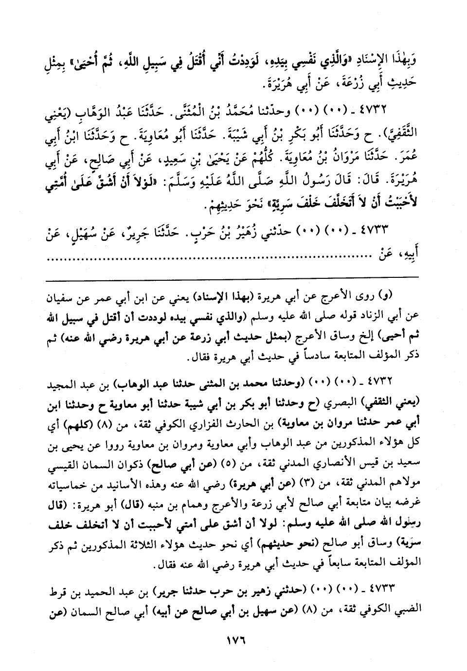 ٤٧٣٢ - (٠٠) (٠٠) وحدّثنا مُحَمَّدُ بْنُ الْمُثَنَّى. حَدَّثَنَا عَبْدُ الوَهَّابِ (يَعنِي الثقَفِيَّ). ح وَحَذَثَنَا أبُو بَكْرِ بْنُ أبِي شَيبَةَ. حَدَّثَنَا أَبُو مُعَاويَةَ. ح وَحَدَّثَنَا ابْنُ أَبِي عُمَرَ. حَدَثنَا مروَانُ بْنُ مُعَاويَةَ. كُلُهُم عَنْ يحيى بْنِ سَعِيدٍ، عَنْ أَبِي صَالِحٍ، عَنْ أَبِي هُرَيرَةَ. قَال: قَال رَسُولُ الله صَلَّى اللَّهُ عَلَيهِ وَسَلمَ: "لَوْلَا أَنْ أَشُقَّ عَلَى أُمتِي لأحَبَبْتُ أَنْ لَا أتخلفَ خَلْفَ سَرِيةٍ" نحوَ حَدِيثِهِم.