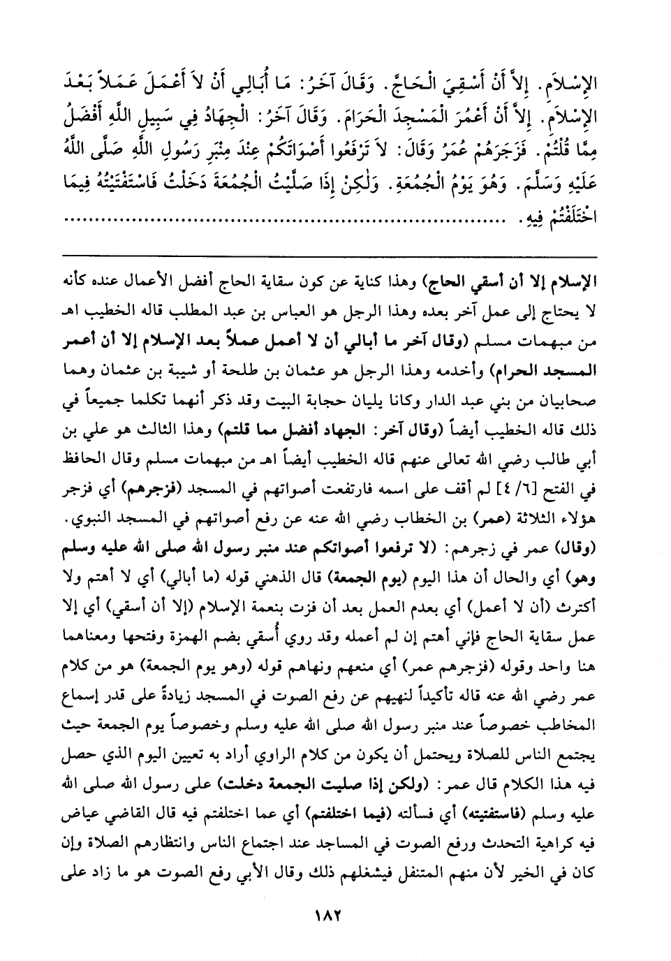 الإسلام إلا أن أسقي الحاج) وهذا كناية عن كون سقاية الحاج أفضل الأعمال عنده كأنه لا يحتاج إلى عمل آخر بعده وهذا الرجل هو العباس بن عبد المطلب قاله الخطيب اهـ من مبهمات مسلم (وقال آخر ما أبالي أن لا أعمل عملًا بعد الإسلام إلا أن أعمر المسجد الحرام) وأخدمه وهذا الرجل هو عثمان بن طلحة أو شيبة بن عثمان وهما صحابيان من بني عبد الدار وكانا يليان حجابة البيت وقد ذكر أنهما تكلما جميعًا في ذلك قاله الخطيب أيضًا (وقال آخر: الجهاد أفضل مما قلتم) وهذا الثالث هو علي بن أبي طالب رضي الله تعالى عنهم قاله الخطيب أيضًا اهـ من مبهمات مسلم وقال الحافظ في الفتح [٦/ ٤] لم أقف على اسمه فارتفعت أصواتهم في المسجد (فزجرهم) أي فزجر هؤلاء الثلاثة (عمر) بن الخطاب رضي الله عنه عن رفع أصواتهم في المسجد النبوي. (وقال) عمر في زجرهم: (لا ترفعوا أصواتكم عند منبر رسول الله صلى الله عليه وسلم وهو) أي والحال أن هذا اليوم (يوم الجمعة) قال الذهني قوله (ما أبالي) أي لا أهتم ولا أكترث (أن لا أعمل) أي بعدم العمل بعد أن فزت بنعمة الإسلام (إلا أن أسقي) أي إلا عمل سقاية الحاج فإني أهتم إن لم أعمله وقد روي اسقي بضم الهمزة وفتحها ومعناهما هنا واحد وقوله (فزجرهم عمر) أي منعهم ونهاهم قوله (وهو يوم الجمعة) هو من كلام عمر رضي الله عنه قاله تأكيدًا لنهيهم عن رفع الصوت في المسجد زيادةً على قدر إسماع المخاطب خصوصًا عند منبر رسول الله صلى الله عليه وسلم وخصوصًا يوم الجمعة حيث يجتمع الناس للصلاة ويحتمل أن يكون من كلام الراوي أراد به تعيين اليوم الذي حصل فيه هذا الكلام قال عمر: (ولكن إذا صليت الجمعة دخلت) على رسول الله صلى الله عليه وسلم (فاستفتيته) أي فسألته (فيما اختلفتم) أي عما اختلفتم فيه قال القاضي عياض فيه كراهية التحدث ورفع الصوت في المساجد عند اجتماع الناس وانتظارهم الصلاة كان كان في الخير لأن منهم المتنفل فيشغلهم ذلك وقال الأبي رفع الصوت هو ما زاد على