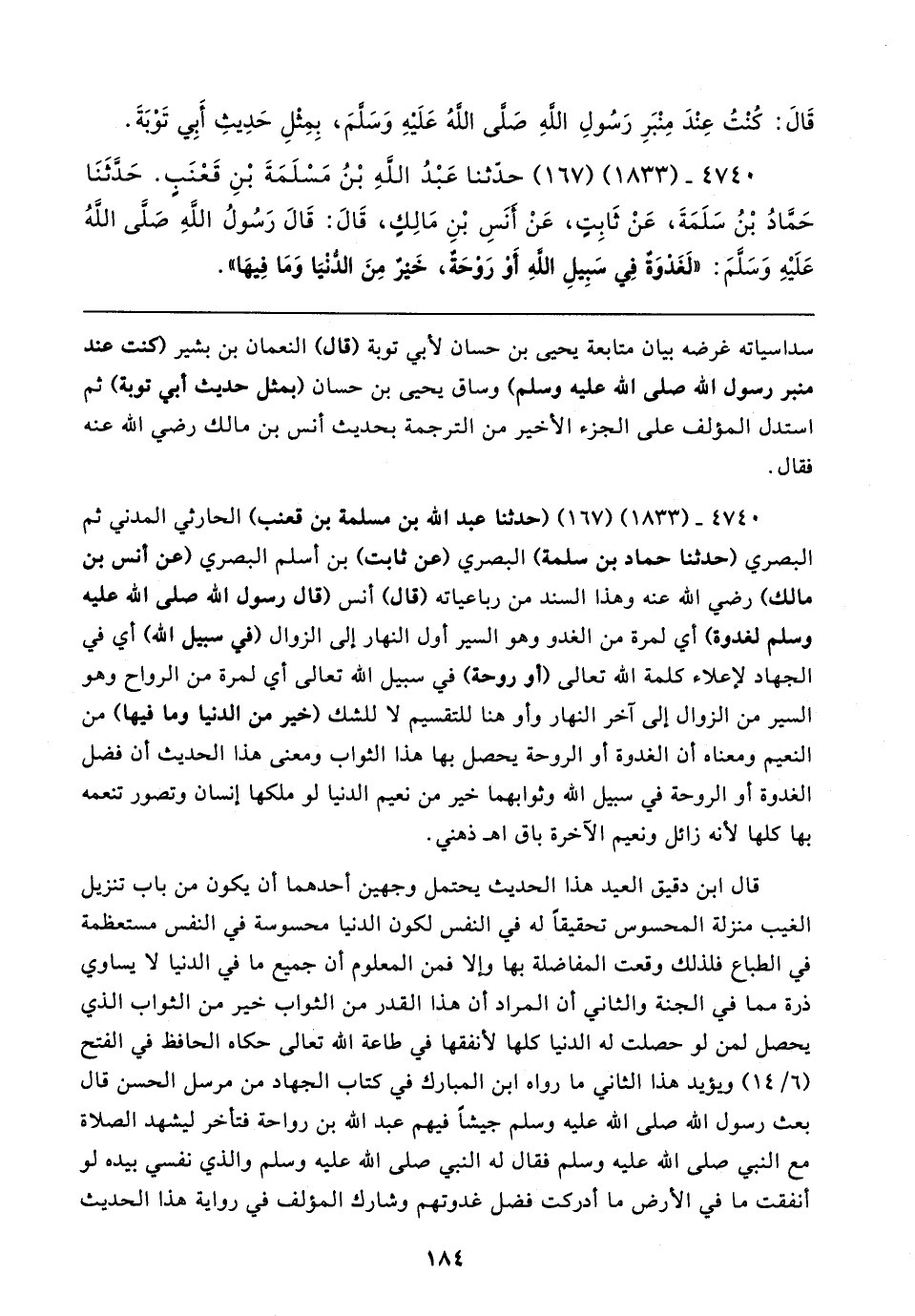 ٤٧٤٠ - (١٨٣٣) (١٦٧) حدَّثنا عَبْدُ الله بْنُ مَسْلَمَةَ بْنِ قعنَبِ. حَدَثَنَا حَمَّادُ بْنُ سَلَمَةَ، عَنْ ثَابِتٍ، عَنْ أنَسِ بْنِ مَالِكٍ، قَال: قَال رَسُولُ الله صَلَّى اللهُ عَلَيهِ وَسَلمَ: "لَغَدْوَةٌ فِي سَبِيلِ الله أَوْ رَوحَةٌ، خَيرٌ مِنَ الدنْيَا وَمَا فِيها"