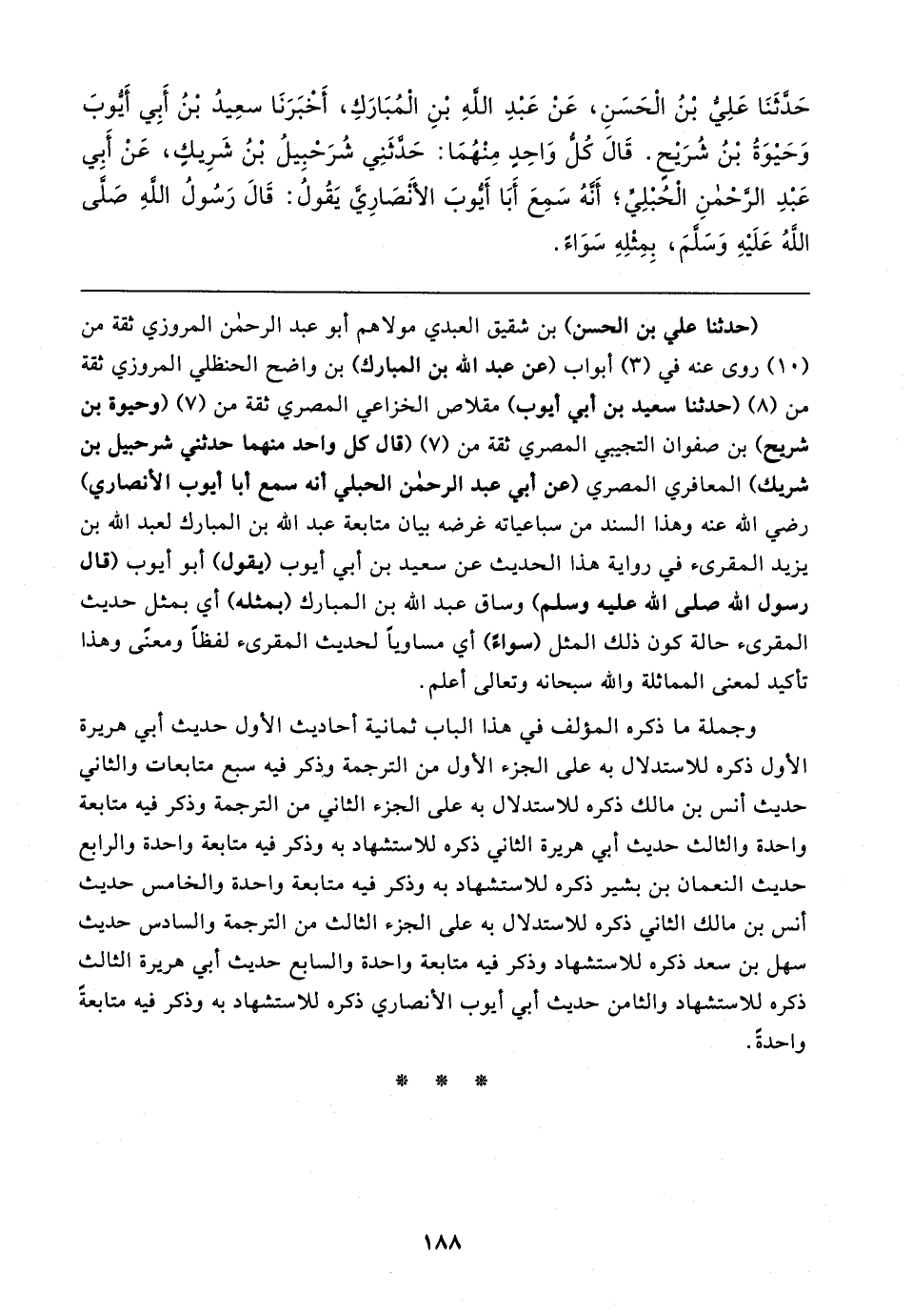 حَدَّثَنَا عَلِيُّ بْنُ الْحَسَنِ، عن عَبْدِ الله بْنِ الْمُبَارَكِ، أخْبَرَنَا سعِيدُ بْنُ أَبِي أَيوبَ وَحَيوَةُ بْنُ شُرَيحٍ. قَال كُل وَاحِدٍ مِنهُمَا: حَدّثَنِي شُرَحبِيلُ بْنُ شَرِيكٍ، عَنْ أَبِي عَبْدِ الرحمن الْحُبْلِي؛ أَنَّهُ سَمِعَ أَبَا أيوبَ الأَنْصَارِي يَقُولُ: قَال رَسُولُ الله صَلى اللهُ عَلَيهِ وَسَلمَ، بِمِثْلِهِ سَوَاءً