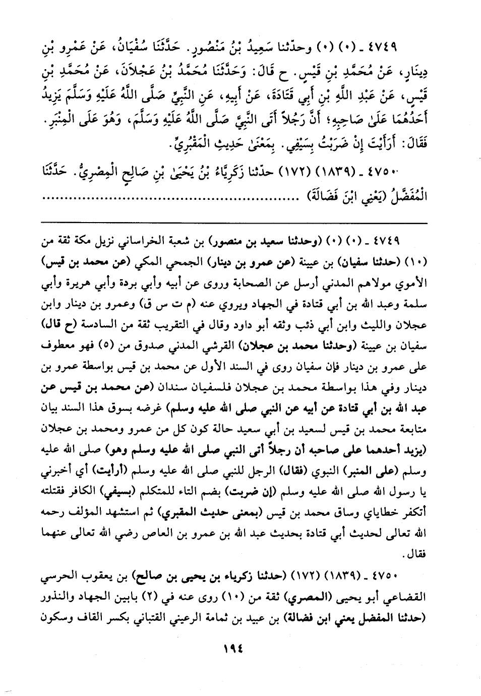٤٧٤٩ - (٠) (٠) وحدّثنا سَعِيدُ بْنُ مَنْصُورٍ. حَدَّثَنَا سُفْيَانُ، عَنْ عَمرِو بْنِ دِينَارٍ، عَنْ مُحَمدِ بْنِ قَيسٍ. ح قَال: وَحَدَّثَنَا مُحَمَّدُ بْنُ عَجْلانَ، عَنْ مُحَمدِ بْنِ قَيسٍ، عَنْ عَبْدِ الله بْنِ أَبِي قَتَادَةَ، عَنْ أَبِيهِ، عَنِ النَّبِيِّ صَلَّى الله عَلَيهِ وَسَلمَ يَزِيدُ أَحَدُهُمَا عَلَى صَاحِبِهِ؛ أَنَّ رَجُلًا أَتَى النَّبِي صَلَّى اللهُ عَلَيهِ وَسَلمَ، وَهُوَ عَلَى الْمِنْبَرِ. فَقَال: أرَأيتَ إِنْ ضَرَبْتُ بِسَيفِي. بِمَعنى حَدِيثِ الْمَقْبُرِيِّ.