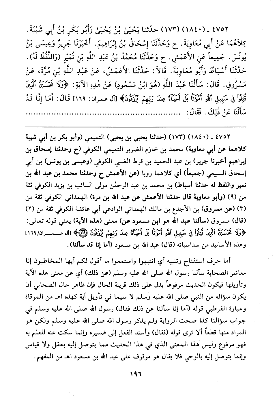 ٤٧٥٢ - (١٨٤٠) (١٧٣) حدَّثنا يحيى بْنُ يحيى وَأبُو بَكْرِ بْنُ أبِي شَيبَةَ. كِلاهُمَا عَنْ أبِي مُعَاويَةَ. ح وَحَدَّثَنَا إِسْحَاقُ بْنُ إِبْرَاهِيمَ. أخْبَرَنَا جَرِيرٌ وَعِيسَى بْنُ يُونُسَ. جَمِيعًا عَنِ الأعمَشِ. ح وَحَدَّثَنَا مُحَمَّدُ بْنُ عَبْدِ الله بْنِ نُمَيرٍ (وَاللَّفُظْ لَهُ). حَدَّثَنَا أَسْبَاطٌ وَأَبُو مُعَاوَيةَ. قَالا: حَدَّثَنَا الأعمَشُ، عَنْ عَبْدِ اللَّهِ بْنِ مُرَّةَ، عَنْ مَسْرُوقٍ. قَال: سألْنَا عَبْدَ اللَّهِ (هُوَ ابْنُ مَسْعُودٍ) عَنْ هذِهِ الآيَةِ: {وَلَا تَحْسَبَنَّ الَّذِينَ قُتِلُوا فِي سَبِيلِ اللَّهِ أَمْوَاتًا بَلْ أَحْيَاءٌ عِنْدَ رَبِّهِمْ يُرْزَقُونَ} [آل عمران: ١٦٩] قَال: أَمَا إِنَا قَدْ سَألْنَا عَنْ ذلِكَ. فَقَال: