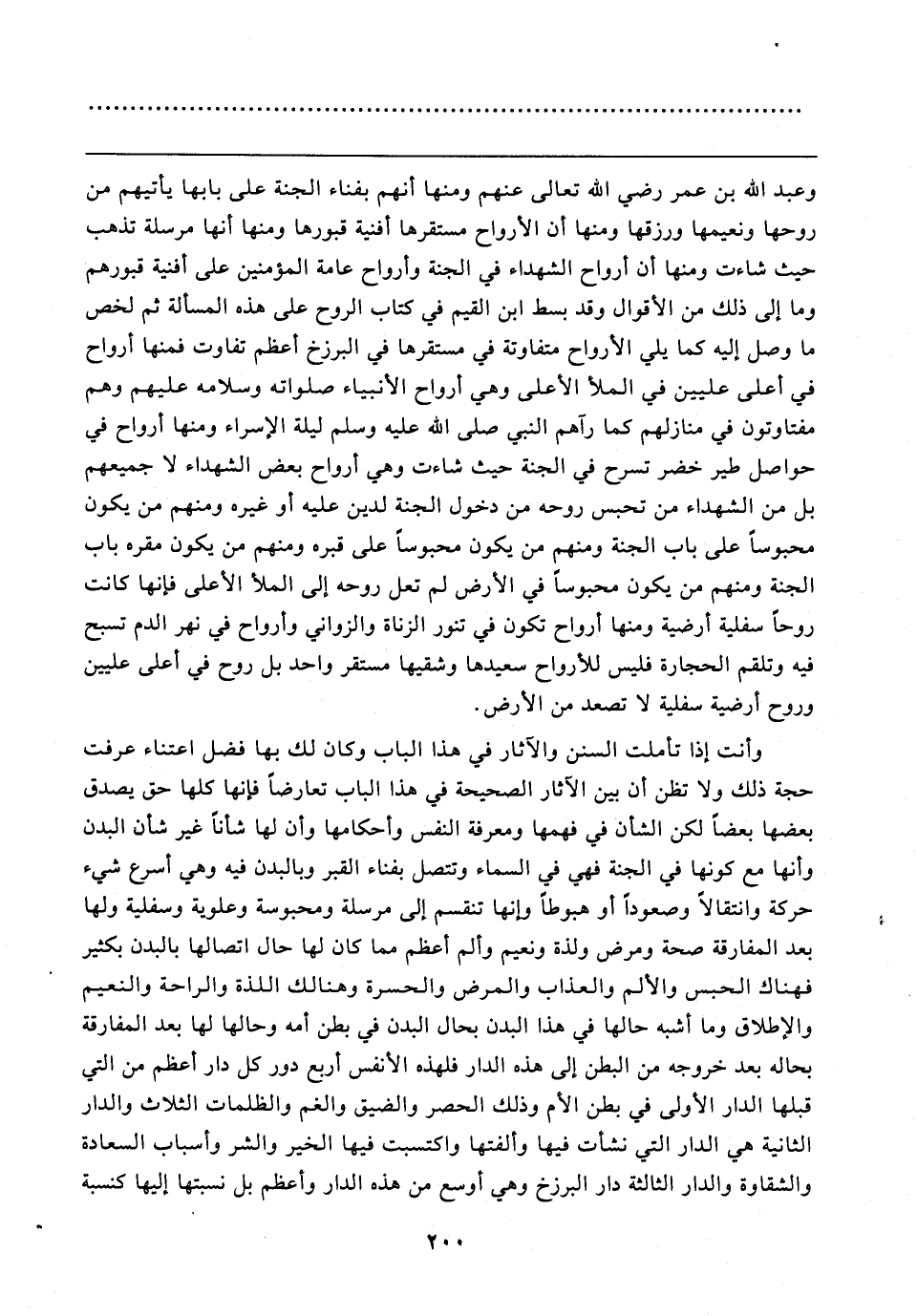 وعبد الله بن عمر رضي الله تعالى عنهم ومنها أنهم بفناء الجنة على بابها يأتيهم من روحها ونعيمها ورزقها ومنها أن الأرواح مستقرها أفنية قبورها ومنها أنها مرسلة تذهب حيث شاءت ومنها أن أرواح الشهداء في الجنة وأرواح عامة المؤمنين على أفنية قبورهم وما إلى ذلك من الأقوال وقد بسط ابن القيم في كتاب الروح على هذه المسألة ثم لخص ما وصل إليه كما يلي الأرواح متفاوتة في مستقرها في البرزخ أعظم تفاوت فمنها أرواح في أعلى عليين في الملأ الأعلى وهي أرواح الأنبياء صلواته وسلامه عليهم وهم مفتاوتون في منازلهم كما رآهم النبي صلى الله عليه وسلم ليلة الإسراء ومنها أرواح في حواصل طير خضر تسرح في الجنة حيث شاءت وهي أرواح بعض الشهداء لا جميعهم بل من الشهداء من تحبس روحه من دخول الجنة لدين عليه أو غيره ومنهم من يكون محبوسًا على باب الجنة ومنهم من يكون محبوسًا على قبره ومنهم من يكون مقره باب الجنة ومنهم من يكون محبوسًا في الأرض لم تعل روحه إلى الملأ الأعلى فإنها كانت روحًا سفلية أرضية ومنها أرواح تكون في تنور الزناة والزواني وأرواح في نهر الدم تسبح فيه وتلقم الحجارة فليس للأرواح سعيدها وشقيها مستقر واحد بل روح في أعلى عليين وروح أرضية سفلية لا تصعد من الأرض.