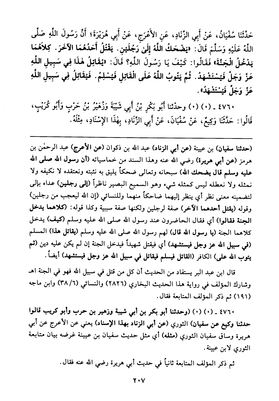 حَدَّثَنَا سُفْيَانُ، عَنْ أَبِي الزِّنَادِ، عَنِ الأَعْرَجِ، عَنْ أَبِي هُرَيرَةَ؛ أَنَّ رَسُولَ اللهِ صَلَّى الله عَلَيهِ وَسَلَّمَ قَال: "يَضْحَكُ اللهُ إِلَى رَجُلَينِ. يَقْتُلُ أَحَدُهُمَا الآخَرَ. كِلاهُمَا يَدْخُلُ الْجَنَّةَ" فَقَالُوا: كَيفَ يَا رَسُولَ اللهِ؟ قَال: "يُقَاتِلُ هذَا فِي سَبِيلِ الله عَزَّ وَجَلَّ فَيُسْتَشْهَدُ. ثُمَّ يَتُوبُ الله عَلَى الْقَاتِلِ فَيُسْلِمُ. فَيُقَاتِلُ فِي سَبِيلِ اللهِ عَزَّ وَجَلَّ فَيُسْتَشْهَدُ".