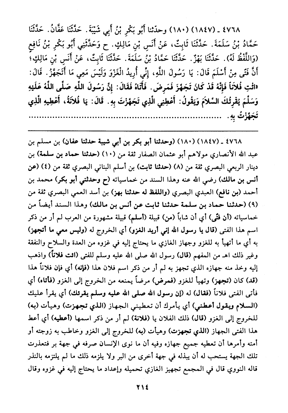 ٤٧٦٨ - (١٨٤٧) (١٨٠) وحدّثنا أَبُو بَكْرِ بْنُ أَبِي شَيبَةَ. حَدَّثنَا عَفَّانُ. حَدَّثَنَا حَمَّادُ بْنُ سَلَمَةَ. حَدَّثَنَا ثَابِتٌ، عَنْ أنَسِ بْنِ مَالِكٍ. ح وَحَدَّثَنِي أَبُو بَكْرِ بْنُ نَافِعٍ (وَاللَّفْظُ لَهُ). حَدَّثنَا بَهْزٌ. حَدَّثنَا حَمَّادُ بْنُ سَلَمَةَ. حَدَّثنَا ثَابِتٌ، عَنْ أنَسِ بْنِ مَالِكٍ؛ أَنَّ فَتًى مِنْ أَسْلَمَ قَال: يَا رَسُولَ الله، إِنِّي أُرِيدُ الْغَزْوَ وَلَيسَ مَعِي مَا أَتَجَهَّزُ. قَال: "ائْتِ فُلانًا فَإنَّهُ قَدْ كَانَ تَجَهَّزَ فَمَرِضَ. فَأَتَاهُ فَقَال: إِنَّ رَسُولَ الله صَلَّى الله عَلَيهِ وَسَلَّمَ يُقْرِئُكَ السَّلامَ وَيَقُولُ: أَعْطِنِي الَّذي تَجَهَّزْتَ بِهِ. قَال: يَا فُلانَةُ، أَعْطِيهِ الَّذِي تَجَهَّزُتُ بِهِ