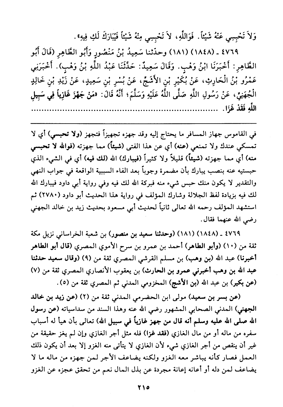 ٤٧٦٩ - (١٨٤٨) (١٨١) وحدّثنا سَعِيدُ بْنُ مَنْصُورٍ وَأَبُو الطَّاهِرِ (قَال أَبُو الطَّاهِرِ: أَخْبَرَنَا ابْنُ وَهْبٍ. وَقَال سَعِيدٌ: حَدَّثَنَا عَبْدُ الله بْنُ وَهْبٍ). أَخْبَرَنِي عَمْرُو بْنُ الْحَارِثِ، عَنْ بُكَيرِ بْنِ الأَشّجِّ، عَنْ بُسْرِ بْنِ سَعِيدٍ، عَنْ زَيدِ بْنِ خَالِدٍ الْجُهَنيِّ، عَنْ رَسُولِ الله صَلَّى اللهُ عَلَيهِ وَسَلَّمَ؛ أَنَّهُ قَال: "مَنْ جَهَّزَ غَازِيًا فِي سَبِيلِ الله فَقَدْ غَزَا