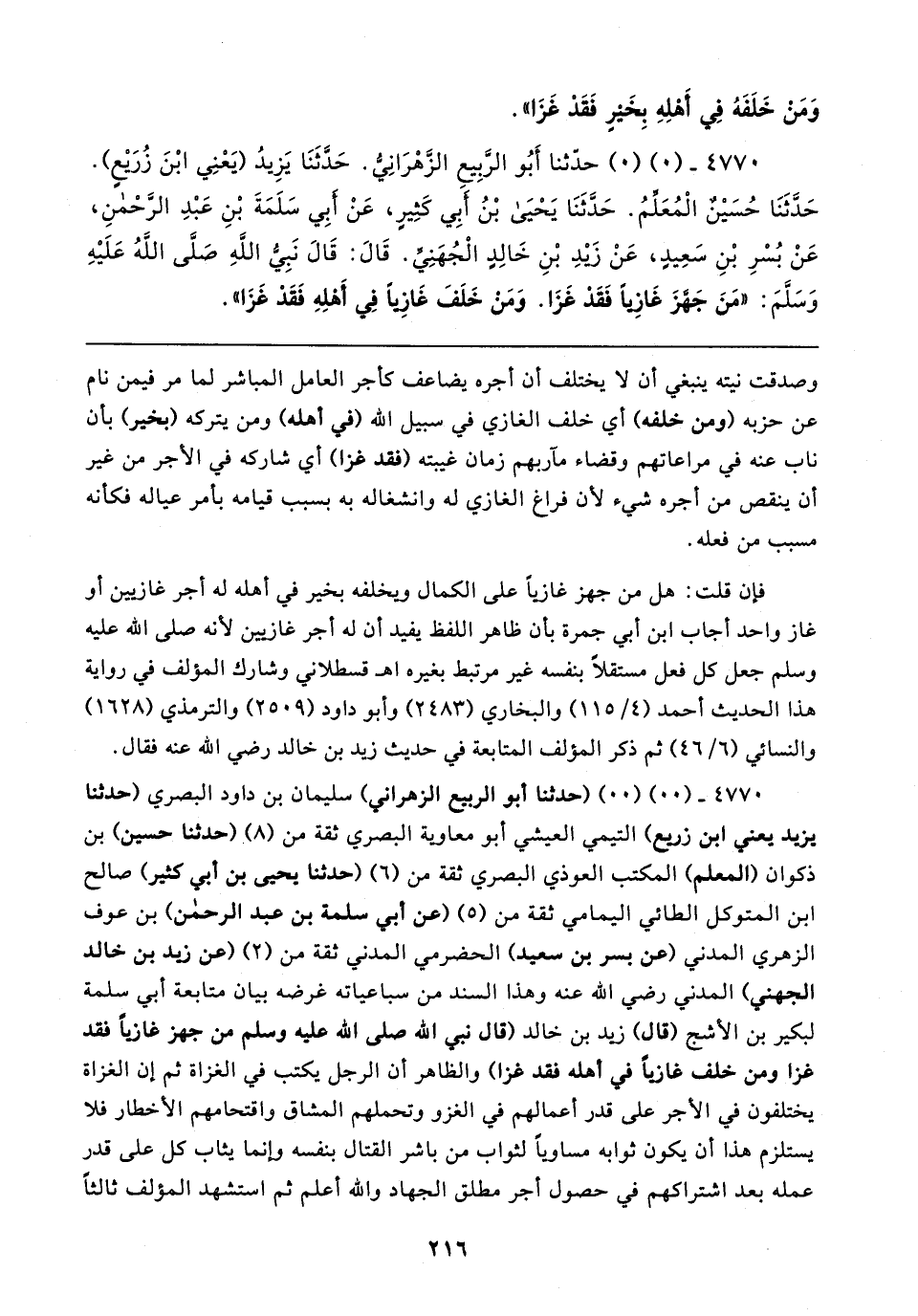 ٤٧٧٠ - (٠) (٠) حدَّثنا أَبُو الرَّبِيع الزَّهْرَانِيُّ. حَدَّثَنَا يَزِيدُ (يَعْنِي ابْنَ زُرَيعٍ). حَدَّثَنَا حُسَينٌ الْمُعَلِّمُ. حَدَّثَنَا يَحْيَى بْنُ أَبِي كَثِيرٍ، عَنْ أَبِي سَلَمَةَ بْنِ عَبْدِ الرَّحْمنِ، عَنْ بُسْرِ بْنِ سَعِيدٍ، عَنْ زَيدِ بْنِ خَالِدٍ الْجُهَنِيِّ. قَال: قَال نَبِيُّ الله صَلَّى اللهُ عَلَيهِ وَسَلَّمَ: "مَنَ جَهَّزَ غَازِيًا فَقَد غَزَا. وَمَنْ خَلَفَ غَازِيًا فِي أَهْلِهِ فَقَدْ غَزَا"