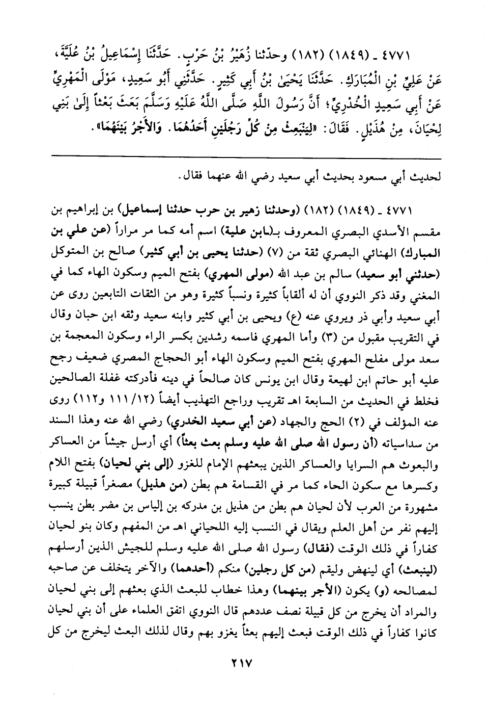٤٧٧١ - (١٨٤٩) (١٨٢) وحدّثنا زُهَيرُ بْنُ حَرْبٍ. حَدَّثنَا إِسْمَاعِيلُ بْنُ عُلَيَّةَ، عَنْ عَلِيِّ بْنِ الْمُبَارَكِ. حَدَّثنَا يَحْيَى بْنُ أَبِي كَثِيرٍ. حَدَّثَنِي أَبُو سَعِيدٍ، مَوْلَى الْمَهْرِيِّ عَنْ أَبِي سَعِيدٍ الْخُدْرِيِّ؛ أَنَّ رَسُولَ الله صَلَّى اللهُ عَلَيهِ وَسَلَّمَ بَعَثَ بَعْثًا إِلَى بَنِي لِحْيَانَ، مِنْ هُذَيلٍ. فَقَال: "لِيَنْبَعِثْ مِنْ كُلِّ رَجُلَينِ أَحَدُهُمَا. وَالأَجْرُ بَينَهُمَا"