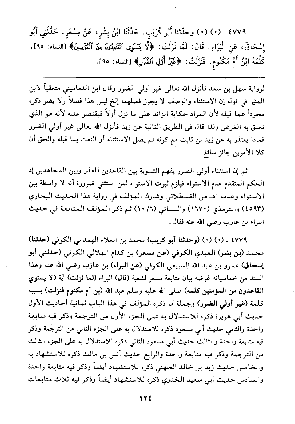 ٤٧٧٩ - (٠) (٠) (وحدثنا أبو كريب) محمد بن العلاء الهمداني الكوفي (حدثنا) محمد (بن بشر) العبدي الكوفي (عن مسعر) بن كدام الهلالي الكوفي (حدثني أبو إسحاق) عمرو بن عبد الله السبيعي الكوفي (عن البراء) بن عازب رضي الله عنه وهذا السند من خماسياته غرضه بيان متابعة مسعر لشعبة (قال) البراء (لما نزلت) آية (لا يستوي القاعدون من المؤمنين كلمه) صلى الله عليه وسلم عبد الله (بن أم مكتوم فنزلت) بسببه كلمة (غير أولي الضرر) وجملة ما ذكره المؤلف في هذا الباب ثمانية أحاديث الأول حديث أبي هريرة ذكره للاستدلال به على الجزء الأول من الترجمة وذكر فيه متابعة واحدة والثاني حديث أبي مسعود ذكره للاستدلال به على الجزء الثاني من الترجمة وذكر فيه متابعة واحدة والثالث حديث أبي مسعود الثاني ذكره للاستدلال به على الجزء الثالث من الترجمة وذكر فيه متابعة واحدة والرابع حديث أنس بن مالك ذكره للاستشهاد به والخامس حديث زيد بن خالد الجهني ذكره للاستشهاد أيضًا وذكر فيه متابعة واحدة والسادس حديث أبي سعيد الخدري ذكره للاستشهاد أيضًا وذكر فيه ثلاث متابعات