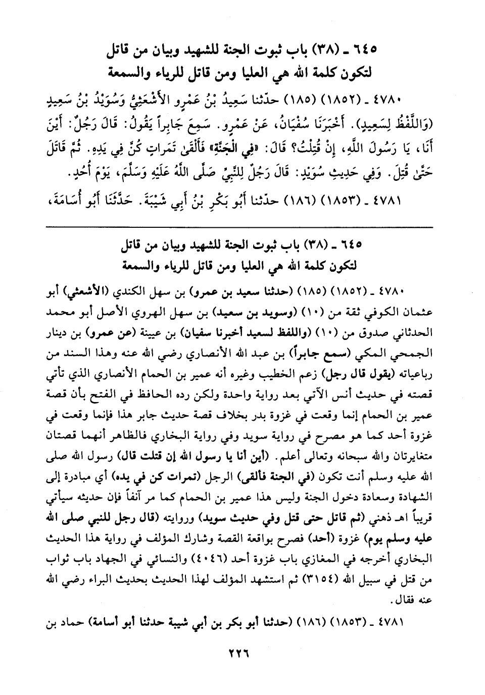٦٤٥ - (٣٨) باب ثبوت الجنة للشهيد وبيان من قاتل لتكون كلمة الله هي العليا ومن قاتل للرياء والسمعة