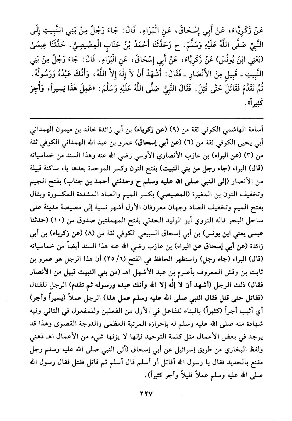 عَنْ زَكَرِيَّاءَ، عَنْ أَبِي إِسْحَاقَ، عَنِ الْبَرَاءِ. قَال: جَاءَ رَجُلٌ مِنْ بَنِي النَّبِيتِ إِلَى النَّبِيِّ صَلَّى اللهُ عَلَيهِ وَسَلَّمَ. ح وَحَدَّثَنَا أَحْمَدُ بْنُ جَنَابٍ الْمِصِّيصِيُّ. حَدَّثَنَا عِيسَى (يَعْنِي ابْنَ يُونُسَ) عَنْ زَكَرِيَّاءَ، عَنْ أَبِي إِسْحَاقَ، عَنِ الْبَرَاءِ. قَال: جَاءَ رَجُلٌ مِنْ بَنِي النَّبِيتِ -قَبِيلِ مِنَ الأَنْصَارِ- فَقَال: أَشْهدُ أَنْ لَا إِله إِلَّا اللهُ، وأَنَّكَ عَبْدُهُ وَرَسُولُهُ. ثُمَّ تَقَدَّمَ فَقَاتَلَ حَتَّى قُتِلَ. فَقَال النَّبِيُّ صَلَّى اللهُ عَلَيهِ وَسَلَّمَ: "عَمِلَ هذَا يَسِيرًا، وَأُجِرَ كَثِيرًا"