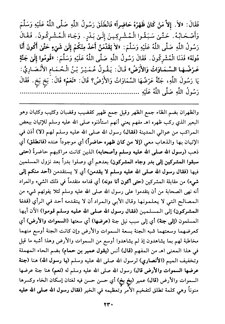 فَقَال: "لَا. إِلَّا مَنْ كَانَ ظَهْرُهُ حَاضِرًا" فَانْطَلَقَ رَسُولُ الله صَلَّى الله عَلَيهِ وَسَلَّمَ وَأَصْحَابُهُ. حَتَّى سَبَقُوا الْمُشْرِكِينَ إِلَى بَدْرٍ. وَجَاءَ الْمُشرِكُونَ. فَقَال رَسُولُ الله صَلَّى الله عَلَيهِ وَسَلَّمَ: "لَا يُقدِّمَنَّ أَحَدٌ مِنْكُمْ إِلَى شَيءٍ حَتَّى أَكُونَ أَنَا دُونَهُ" فَدَنَا الْمُشْرِكُونَ. فَقَال رَسُولُ الله صَلَّى الله عَلَيهِ وَسَلَّمَ: "قُومُوا إِلَى جَنَّةٍ عَرْضُهَا السَّمَاوَاتُ وَالأَرْضُ" قَال: يَقُولُ عُمَيرُ بْنُ الْحُمَامِ الأَنْصَارِيُّ: يَا رَسُولَ الله، جَنَّةٌ عَرْضُهَا السَّمَاوَاتُ وَالأَرْضُ؟ قَال: "نَعَمْ" قَال: بَخٍ بَخٍ. فَقَال رَسُولُ الله صَلَّى الله عَلَيهِ