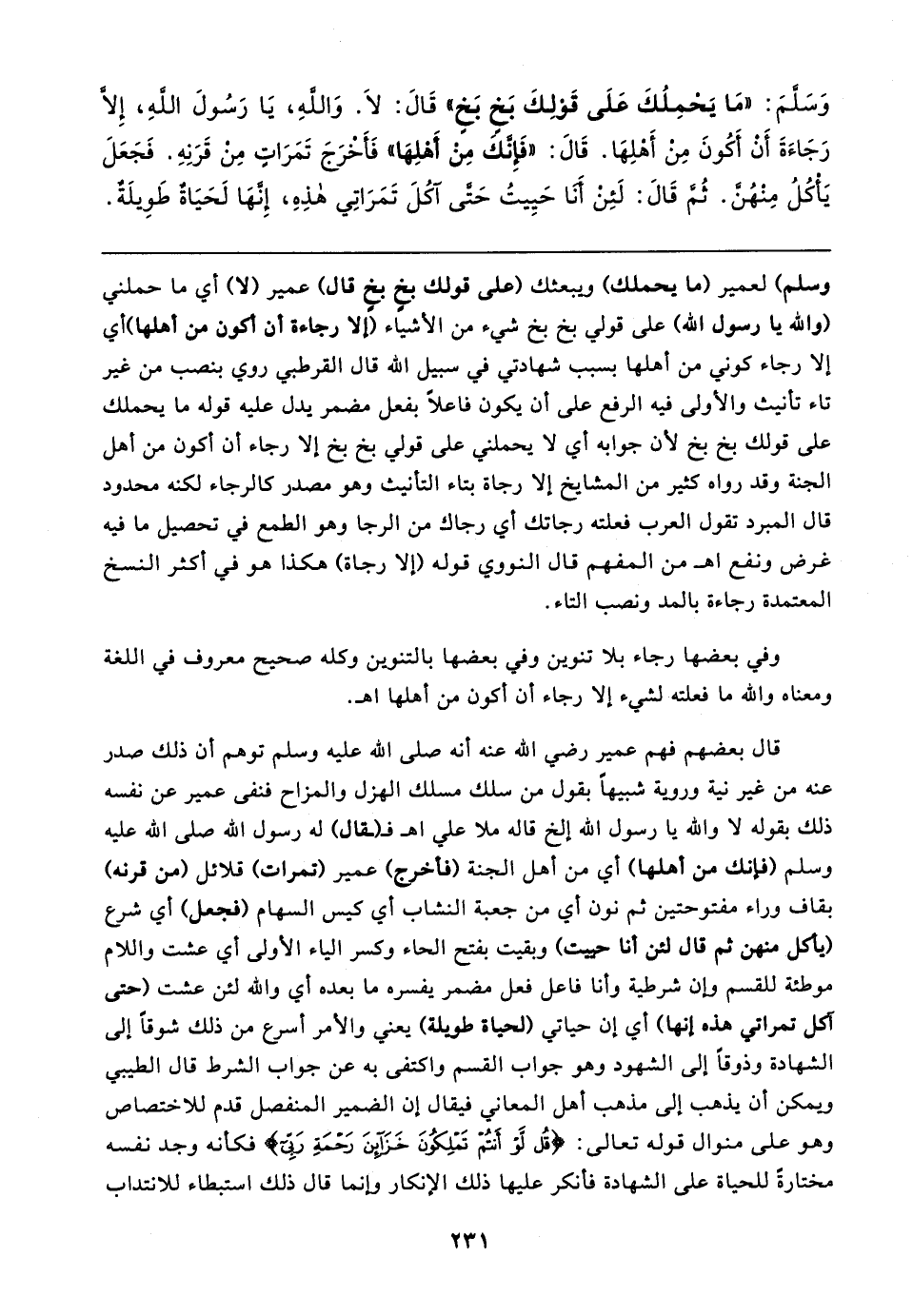 وَسَلَّمَ: "مَا يَحْمِلُكَ عَلَى قَوْلِكَ بَخٍ بَخٍ" قَال: لَا. وَاللهِ، يَا رَسُولَ الله، إِلَّا رَجَاءَةَ أَنْ أَكُونَ مِنْ أَهْلِهَا. قَال: "فَإنَّكَ مِنْ أَهْلِهَا" فَأَخْرَجَ تَمَرَاتٍ مِنْ قَرَنِهِ. فَجَعَلَ يَأكُلُ مِنْهُنَّ. ثُمَّ قَال: لَئِنْ أَنَا حَيِيتُ حَتَّى آكُلَ تَمَرَاتِي هذِهِ، إِنَّهَا لَحَيَاةٌ طَويلَةٌ