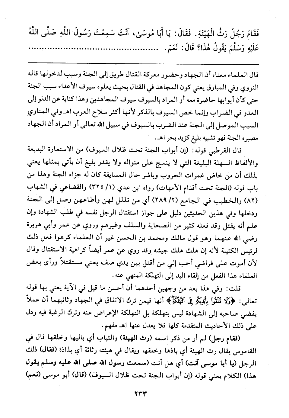 قلت: وفي هذا بعد من وجهين أحدهما أن أحسن ما قيل في الآية يعني بها قوله تعالى: {وَلَا تُلْقُوا بِأَيدِيكُمْ إِلَى التَّهْلُكَةِ} أنها فيمن ترك الاتفاق في الجهاد وثانيهما أن عملًا يفضي صاحبه إلى الشهادة ليس بتهلكة بل التهلكة الإعراض عنه وترك الرغبة فيه ودل على ذلك الأحاديث المتقدمة كلها فلا يعدل عنها اهـ مفهم.