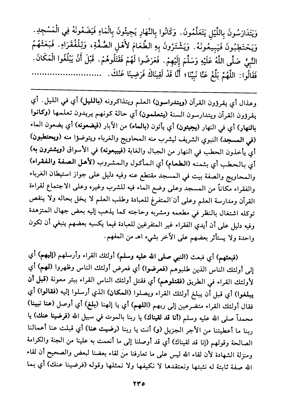 وَيتَدَارَسُونَ بِاللَّيلِ يَتَعَلَّمُونَ. وَكَانُوا بِالنَّهَارِ يَجِيئُونَ بِالْمَاءِ فَيَضَعُونَهُ فِي الْمَسْجِدِ. وَيَحْتَطِبُونَ فَيَبِيعُونَهُ. وَيَشْتَرُونَ بِهِ الطَّعَامَ لأَهْلِ الصُّفَّةِ، وَلِلْفُقَرَاءِ. فَبَعَثَهُمُ النّبِيُّ صَلَّى الله عَلَيهِ وَسَلَّمَ إِلَيهِمْ. فَعَرَضُوا لَهُمْ فَقَتَلُوهُمْ. قَبْلَ أَنْ يَبْلُغُوا الْمَكَانَ. فَقَالُوا: اللَّهُمَّ بَلِّغْ عَنِّا نَبِيَّنَا؛ أَنَّا قَدْ لَقِينَاكَ فَرَضِينَا عَنْكَ