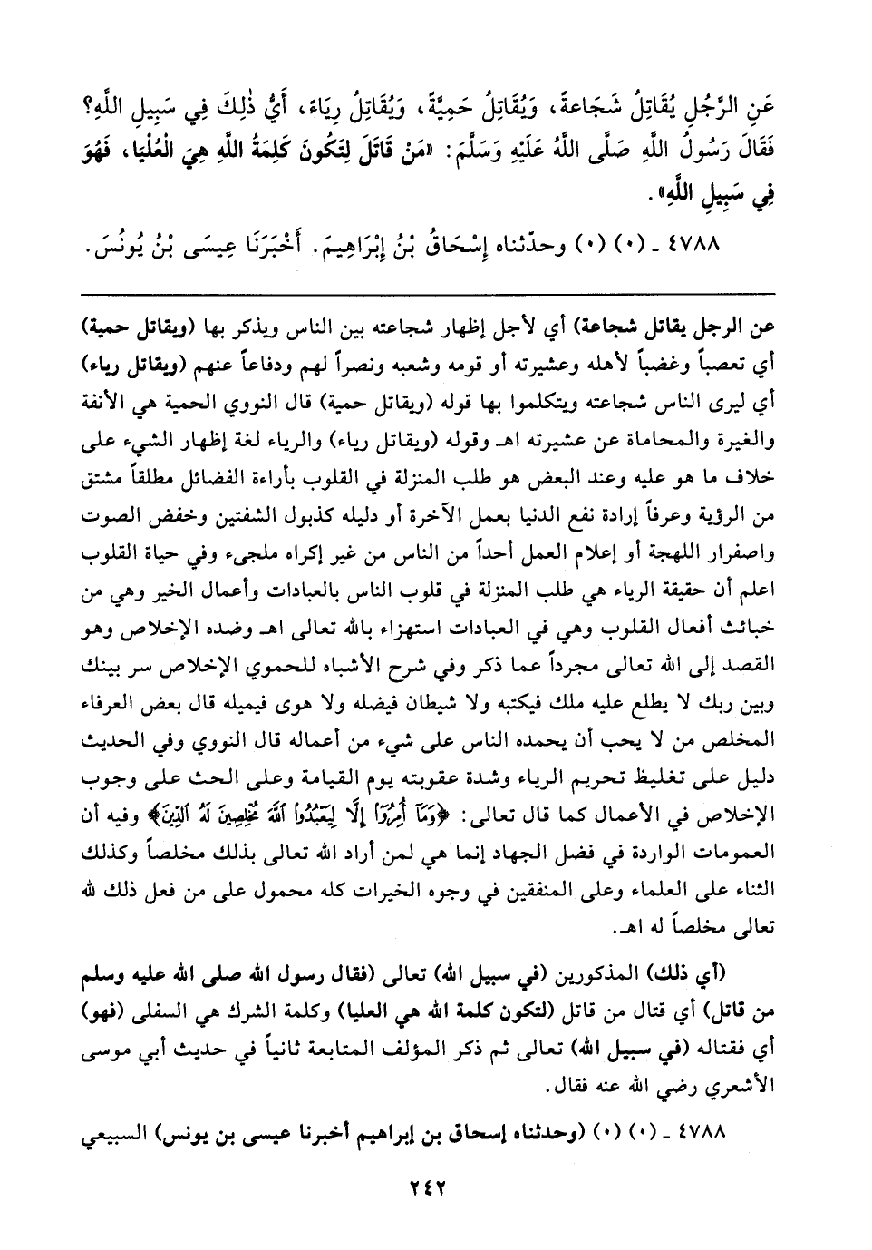 عَنِ الرجُلِ يُقَاتِلُ شَجَاعةً، ويقَاتِلُ حَمِيةً، ويقَاتِلُ رَياءً، أَيُّ ذلِكَ فِي سَبِيلِ الله؟ فَقَال رَسُولُ الله صَلى الله عَلَيهِ وَسَلمَ: "مَنْ قَاتَلَ لِتَكُونَ كَلِمَةُ الله هِيَ العليَا، فَهُوَ فِي سَبِيلِ الله".