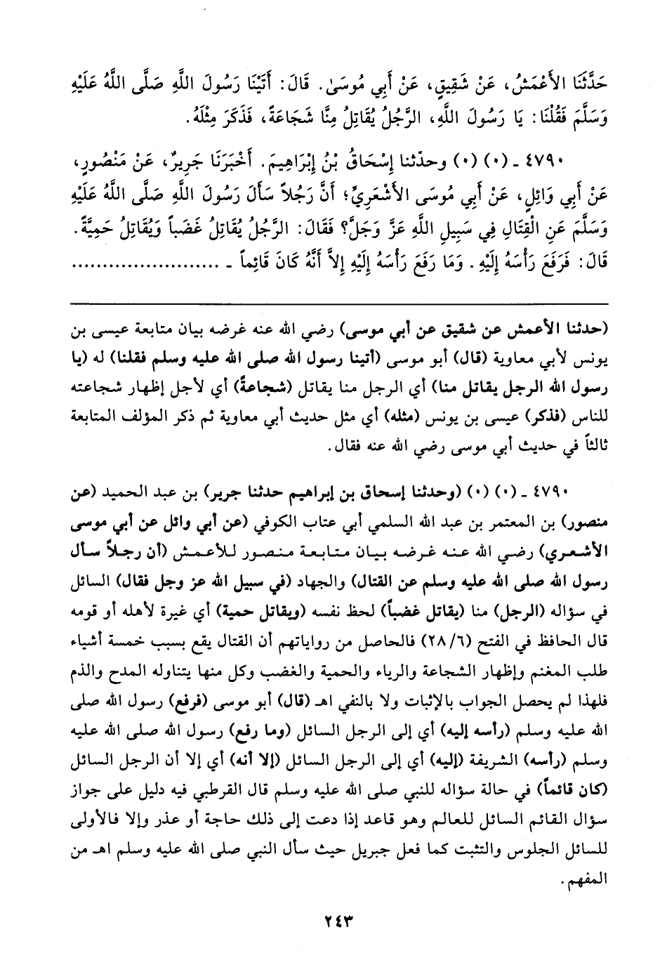 ٤٧٩٠ - (٠) (٠) وحدّثنا إِسْحَاقُ بْنُ إِبْرَاهِيمَ. أَخْبَرَنَا جَرِيرٌ، عَنْ مَنْصُورٍ، عَنْ أبِي وَائلٍ، عَنْ أبِي مُوسَى الأشْعَرِي؛ أَنَّ رَجُلًا سَألَ رَسُولَ الله صَلَّى اللَّهُ عَلَيهِ وَسَلَّمَ عَنِ الْقِتَالِ فِي سَبِيلِ الله عَزَّ وَجَلَّ؟ فَقَال: الرجُلُ يُقَاتِلُ غَضَبًا ويقَاتِلُ حَميَّةً. قَال: فَرَفَعَ رَأسَهُ إِلَيهِ. وَمَا رَفَعَ رأسَهُ إِلَيهِ إِلا أَنَّهُ كَانَ قَائمًا-