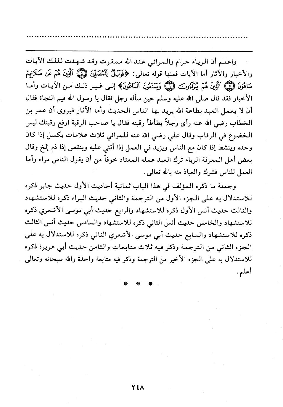 واعلم أن الرياء حرام والمرائي عند الله ممقوت وقد شهدت لذلك الآيات والأخبار والآثار أما الآيات فمنها قوله تعالى: {فَوَيلٌ لِلْمُصَلِّينَ (٤) الَّذِينَ هُمْ عَنْ صَلَاتِهِمْ سَاهُونَ (٥) الَّذِينَ هُمْ يُرَاءُونَ (٦) وَيَمْنَعُونَ الْمَاعُونَ} إلى غير ذلك من الآيات وأما الأخبار فقد قال صلى الله عليه وسلم حين سأله رجل فقال يا رسول الله فيم النجاة فقال أن لا يعمل العبد بطاعة الله يريد بها الناس الحديث وأما الآثار فيروى أن عمر بن الخطاب رضي الله عنه رأى رجلًا يطأطأ رقبته فقال يا صاحب الرقبة ارفع رقبتك ليس الخضوع في الرقاب وقال علي رضي الله عنه للمرائي ثلاث علامات يكسل إذا كان وحده وينشط إذا كان مع الناس ويزيد في العمل إذا أثني عليه وينقص إذا ذم إلخ وقال بعض أهل المعرفة الرياء ترك العبد عمله المعتاد خوفًا من أن يقول الناس مراء وأما العمل للناس فشرك والعياذ منه بالله تعالى.
