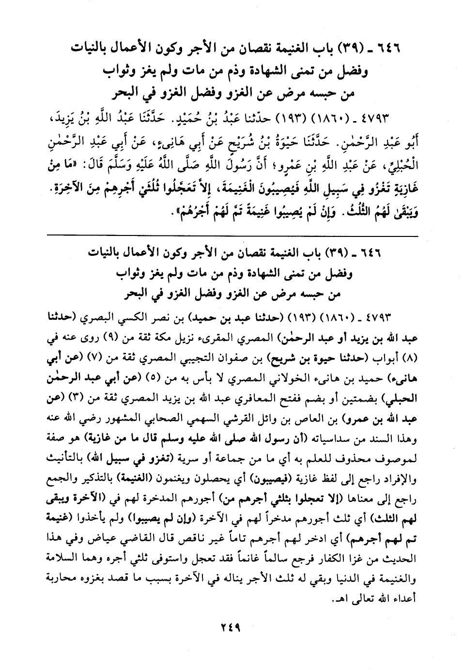 ٤٧٩٣ - (١٨٦٠) (١٩٣) حدَّثنا عَبْدُ بْنُ حُمَيدٍ. حدَثَنَا عَبْدُ الله بْنُ يَزِيدَ، أَبُو عَبْدِ الرحمنِ. حَدَثَنَا حَيوَةُ بْنُ شُرَيحٍ عَنْ أَبِي هانِئٍ، عَنْ أَبِي عَبْدِ الرحمنِ الْحُبْلِي، عَنْ عَبْدِ الله بْنِ عَمرٍو؛ أَنَّ رَسُولَ الله صَلَّى اللهُ عَلَيهِ وَسَلمَ قَال: "مَا مِنْ غَازِيةٍ تَغزُو فِي سَبِيلِ الله فَيُصِيبُونَ الْغَنِيمَةَ، إِلَّا تَعَجَّلُوا ثُلُثَي أَجرِهم مِنَ الآخِرَةِ. وَبَبقَى لَهُمُ الثلُثُ. وَإِنْ لَمْ يُصِيبُوا غَنِيمَةً تمَّ لَهُم أَجرُهُم"