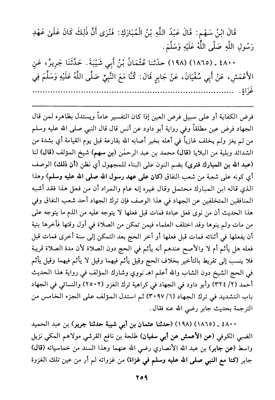 ٤٨٠٠ - (١٨٦٥) (١٩٨) (حدثنا عثمان بن أبي شيبة حدثنا جرير) بن عبد الحميد الضبي الكوفي (عن الأعمش عن أبي سفيان) طلحة بن نافع القرشي مولاهم المكي نزيل واسط (عن جابر) بن عبد الله الأنصاري رضي الله عنهما وهذا السند من خماسياته (قال) جابر (كنا مع النبي صلى الله عليه وسلم في غزاة) من غزواته لم أر من عين تلك الغزوة