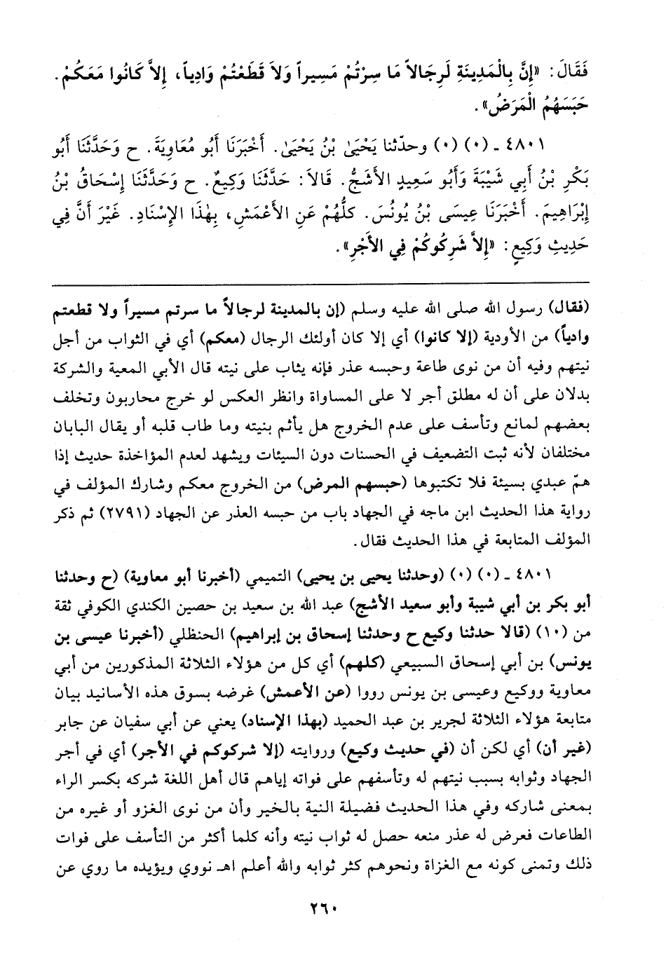 ٤٨٠١ - (٠) (٠) (وحدثنا يحيى بن يحيى) التميمي (أخبرنا أبو معاوية) (ح وحدثنا أبو بكر بن أبي شيبة وأبو سعيد الأشج) عبد الله بن سعيد بن حصين الكندي الكوفي ثقة من (١٠) (قالا حدثنا وكيع ح وحدثنا إسحاق بن إبراهيم) الحنظلي (أخبرنا عيسى بن يونس) بن أبي إسحاق السبيعي (كلهم) أي كل من هؤلاء الثلاثة المذكورين من أبي معاوية ووكيع وعيسى بن يونس رووا (عن الأعمش) غرضه بسوق هذه الأسانيد بيان متابعة هؤلاء الثلاثة لجرير بن عبد الحميد (بهذا الإسناد) يعني عن أبي سفيان عن جابر (غير أن) أي لكن أن (في حديث وكيع) وروايته (إلا شركوكم في الأجر) أي في أجر الجهاد وثوابه بسبب نيتهم له وتأسفهم على فواته إياهم قال أهل اللغة شركه بكسر الراء بمعنى شاركه وفي هذا الحديث فضيلة النية بالخير وأن من نوى الغزو أو غيره من الطاعات فعرض له عذر منعه حصل له ثواب نيته وأنه كما أكثر من التأسف على فوات ذلك وتمنى كونه مع الغزاة ونحوهم كثر ثوابه والله أعلم اهـ نووي ويؤيده ما روي عن