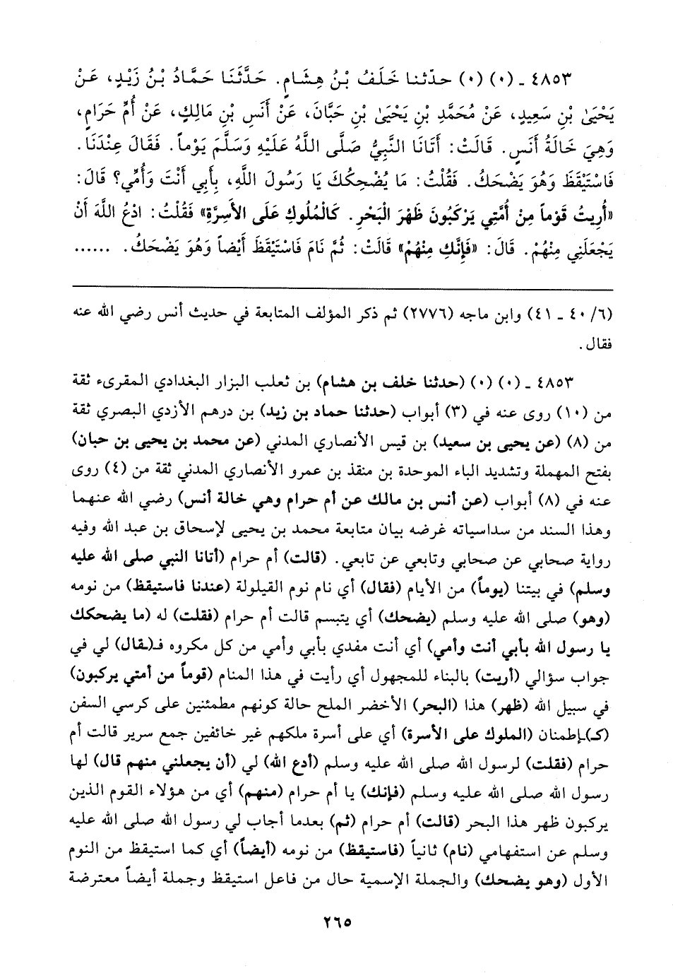 ٤٨٥٣ - (٠) (٠) حدَّثنا خَلَفُ بْنُ هِشَامٍ. حَدَّثَنَا حَمَّادُ بْنُ زَيدٍ، عَنْ يَحْيَى بْنِ سَعِيدٍ، عَنْ مُحَمَّدِ بْنِ يَحْيَى بْنِ حَبَّانَ، عَنْ أَنَسِ بْنِ مَالِكٍ، عَنْ أُمِّ حَرَامٍ، وَهِيَ خَالةُ أَنَسٍ. قَالتْ: أَتَانَا النَّبِيُّ صَلَّى اللهُ عَلَيهِ وَسَلَّمَ يَوْمًا. فَقَال عِنْدَنَا. فَاسْتَيقَظَ وَهُوَ يَضْحَكُ. فَقُلْتُ: مَا يُضْحِكُكَ يَا رَسُولَ اللهِ، بِأَبِي أَنْتَ وَأُمِّي؟ قَال: "أُرِيتُ قَوْمًا مِنْ أُمَّتِي يَرْكَبُونَ ظَهْرَ الْبَحْرِ. كالمُلُوكِ عَلَى الأَسِرَّةِ" فَقُلْتُ: ادْعُ اللهَ أَنْ يَجْعَلَنِي مِنْهُمْ. قَال: "فَإِنَّكِ مِنْهُمْ" قَالتْ: ثُمَّ نَامَ فَاسْتَيقَظَ أَيضًا وَهُوَ يَضْحَكُ