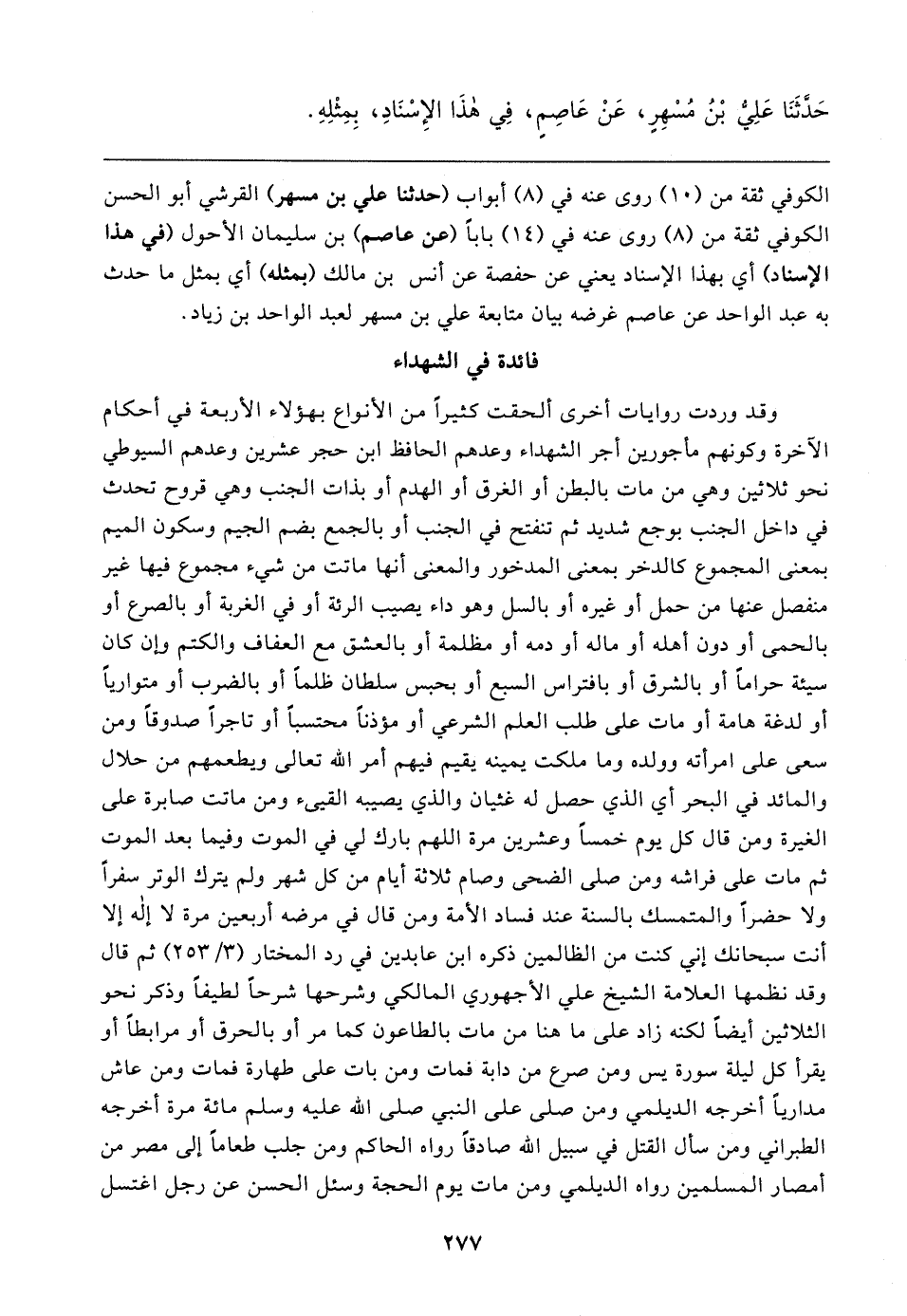 وقد وردت روايات أخرى ألحقت كثيرًا من الأنواع بهؤلاء الأربعة في أحكام الآخرة وكونهم مأجورين أجر الشهداء وعدهم الحافظ ابن حجر عشرين وعدهم السيوطي نحو ثلاثين وهي من مات بالبطن أو الغرق أو الهدم أو بذات الجنب وهي قروح تحدث في داخل الجنب بوجع شديد ثم تنفتح في الجنب أو بالجمع بضم الجيم وسكون الميم بمعنى المجموع كالدخر بمعنى المدخور والمعنى أنها ماتت من شيء مجموع فيها غير منفصل عنها من حمل أو غيره أو بالسل وهو داء يصيب الرئة أو في الغربة أو بالصرع أو بالحمى أو دون أهله أو ماله أو دمه أو مظلمة أو بالعشق مع العفاف والكتم وإن كان سيئة حرامًا أو بالشرق أو بافتراس السبع أو بحبس سلطان ظلمًا أو بالضرب أو متواريًا أو لدغة هامة أو مات على طلب العلم الشرعي أو مؤذنًا محتسبًا أو تاجرًا صدوقًا ومن سعى على امرأته وولده وما ملكت يمينه يقيم فيهم أمر الله تعالى ويطعمهم من حلال والمائد في البحر أي الذي حصل له غثيان والذي يصيبه القيئ ومن ماتت صابرة على الغيرة ومن قال كل يوم خمسًا وعشرين مرة اللهم بارك لي في الموت وفيما بعد الموت ثم مات على فراشه ومن صلى الضحى وصام ثلاثة أيام من كل شهر ولم يترك الوتر سفرًا ولا حضرًا والمتمسك بالسنة عند فساد الأمة ومن قال في مرضه أربعين مرة لا إله إلا أنت سبحانك إني كنت من الظالمين ذكره ابن عابدين في رد المختار (٣/ ٢٥٣) ثم قال وقد نظمها العلامة الشيخ علي الأجهوري المالكي وشرحها شرحًا لطيفًا وذكر نحو الثلاثين أيضًا لكنه زاد على ما هنا من مات بالطاعون كما مر أو بالحرق أو مرابطًا أو يقرأ كل ليلة سورة يس ومن صرع من دابة فمات ومن بات على طهارة فمات ومن عاش مداريًا أخرجه الديلمي ومن صلى على النبي صلى الله عليه وسلم مائة مرة أخرجه الطبراني ومن سأل القتل في سبيل الله صادقًا رواه الحاكم ومن جلب طعامًا إلى مصر من أمصار المسلمين رواه الديلمي ومن مات يوم الحجة وسئل الحسن عن رجل اغتسل