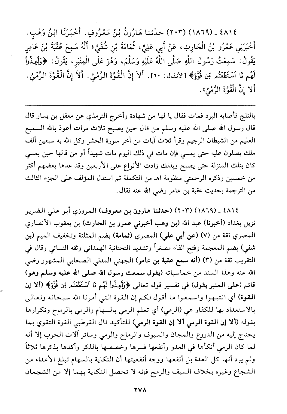 ٤٨١٤ - (١٨٦٩) (٢٠٣) (حدثنا هارون بن معروف) المروزي أبو علي الضرير نزيل بغداد (أخبرنا) عبد الله (بن وهب أخبرني عمرو بن الحارث) بن يعقوب الأنصاري المصري ثقة من (٧) (عن أبي علي) المصري (ثمامة) بضم المثلثة وتخفيف الميم (بن شفي) بضم المعجمة وفتح الفاء مصغرًا وتشديد التحتانية الهمداني وثقه النسائي وقال في التقريب ثقة من (٣) (أنه سمع عقبة بن عامر) الجهني المدني الصحابي المشهور رضي الله عنه وهذا السند من خماسياته (يقول سمعت رسول الله صلى الله عليه وسلم وهو) قائم (على المنبر يقول) في تفسير قوله تعالى {وَأَعِدُّوا لَهُمْ مَا اسْتَطَعْتُمْ مِنْ قُوَّةٍ} (ألا إن القوة) أي انتبهوا واسمعوا ما أقول لكم إن القوة التي أمرنا الله سبحانه وتعالى بالاستعداد بها للكفار هي (الرمي) أي تعلم الرمي بالسهام والرمي بالرماح وتكرارها بقوله (ألا إن القوة الرمي ألا إن القوة الرمي) للتأكيد قال القرطبي القوة التقوي بما يحتاج إليه من الدروع والمجان والسيوف والرماح والرمي وسائر آلات الحرب إلا أنه لما كان الرمي أنكأها في العدو وأنفعها فسرها وخصصها بالذكر وأكدها بذكرها ثلاثًا ولم يرد أنها كل العدة بل أنفعها ووجه أنفعيتها أن النكاية بالسهام تبلغ الأعداء من الشجاع وغيره بخلاف السيف والرمح فإنه لا تحصل النكاية بهما إلا من الشجعان