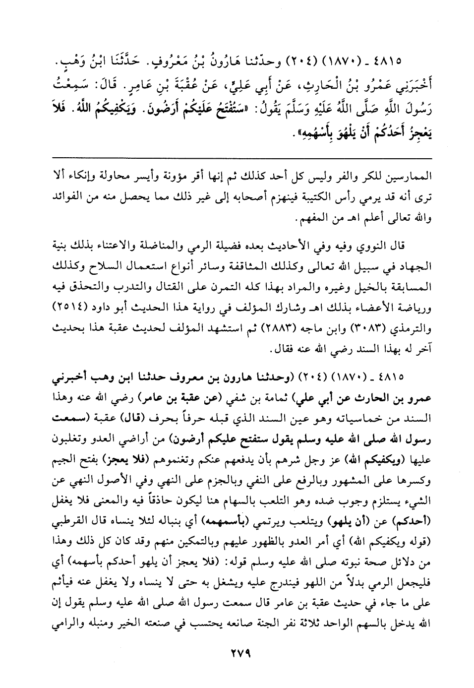 ٤٨١٥ - (١٨٧٠) (٢٠٤) وحدّثنا هَارُونُ بْنُ مَعْرُوفٍ. حَدَّثَنَا ابْنُ وَهْبٍ. أَخْبَرَنِي عَمْرُو بْنُ الْحَارِثِ، عَنْ أَبِي عَلِيٍّ، عَنْ عُقْبَةَ بْنِ عَامِرٍ. قَال: سَمِعْتُ رَسُولَ اللهِ صَلَّى اللَّهُ عَلَيهِ وَسَلَّمَ يَقُولُ: "سَتُفْتَحُ عَلَيكُمْ أَرَضُونَ. وَيَكْفِيكُمُ اللهُ. فَلَا يَعْجِزُ أَحَدُكُمْ أَنْ يَلْهُوَ بِأَسْهُمِهِ"