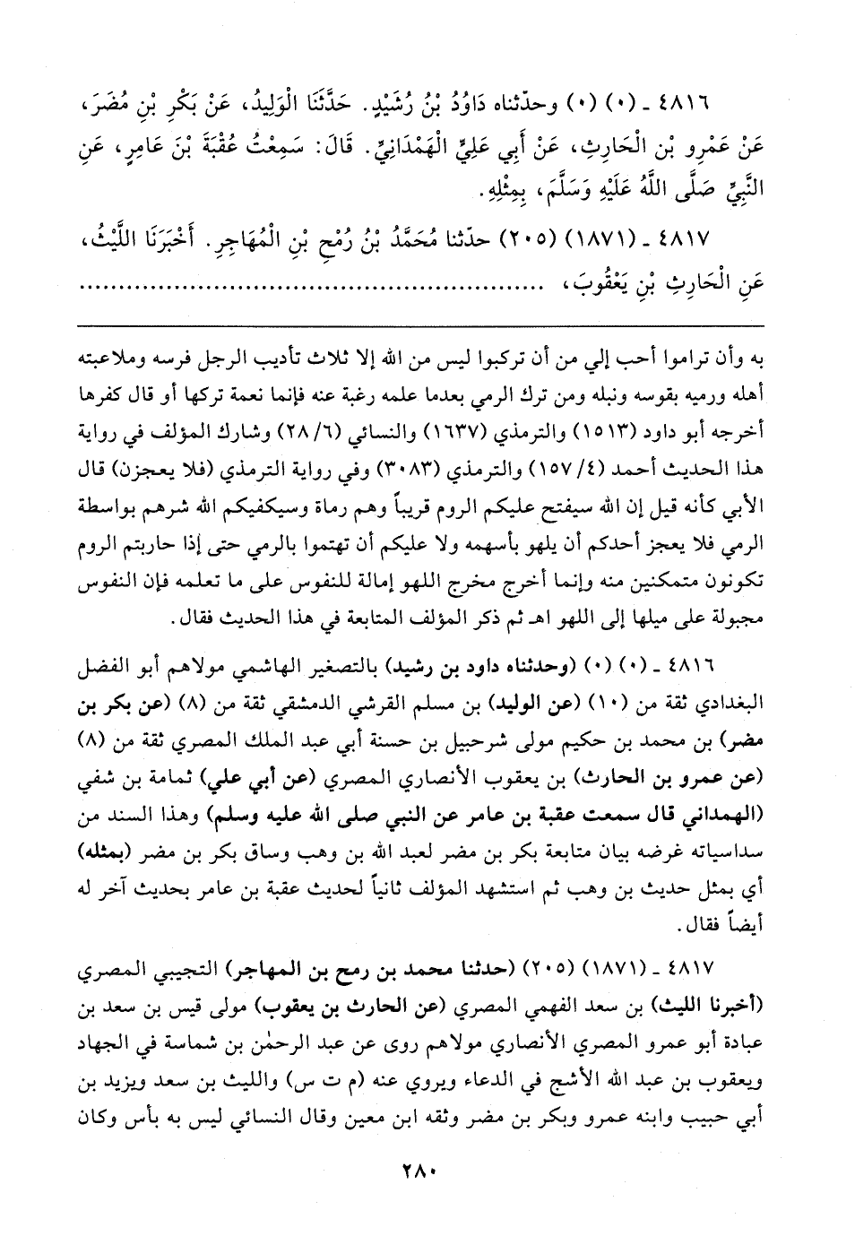 ٤٨١٦ - (٠) (٠) (وحدئناه داود بن رشيد) بالتصغير الهاشمي مولاهم أبو الفضل البغدادي ثقة من (١٠) (عن الوليد) بن مسلم القرشي الدمشقي ثقة من (٨) (عن بكر بن مضر) بن محمد بن حكيم مولى شرحبيل بن حسنة أبي عبد الملك المصري ثقة من (٨) (عن عمرو بن الحارث) بن يعقوب الأنصاري المصري (عن أبي علي) ثمامة بن شفي (الهمداني قال سمعت عقبة بن عامر عن النبي صلى الله عليه وسلم) وهذا السند من سداسياته غرضه بيان متابعة بكر بن مضر لعبد الله بن وهب وساق بكر بن مضر (بمثله) أي بمثل حديث بن وهب ثم استشهد المؤلف ثانيًا لحديث عقبة بن عامر بحديث آخر له أيضًا فقال.