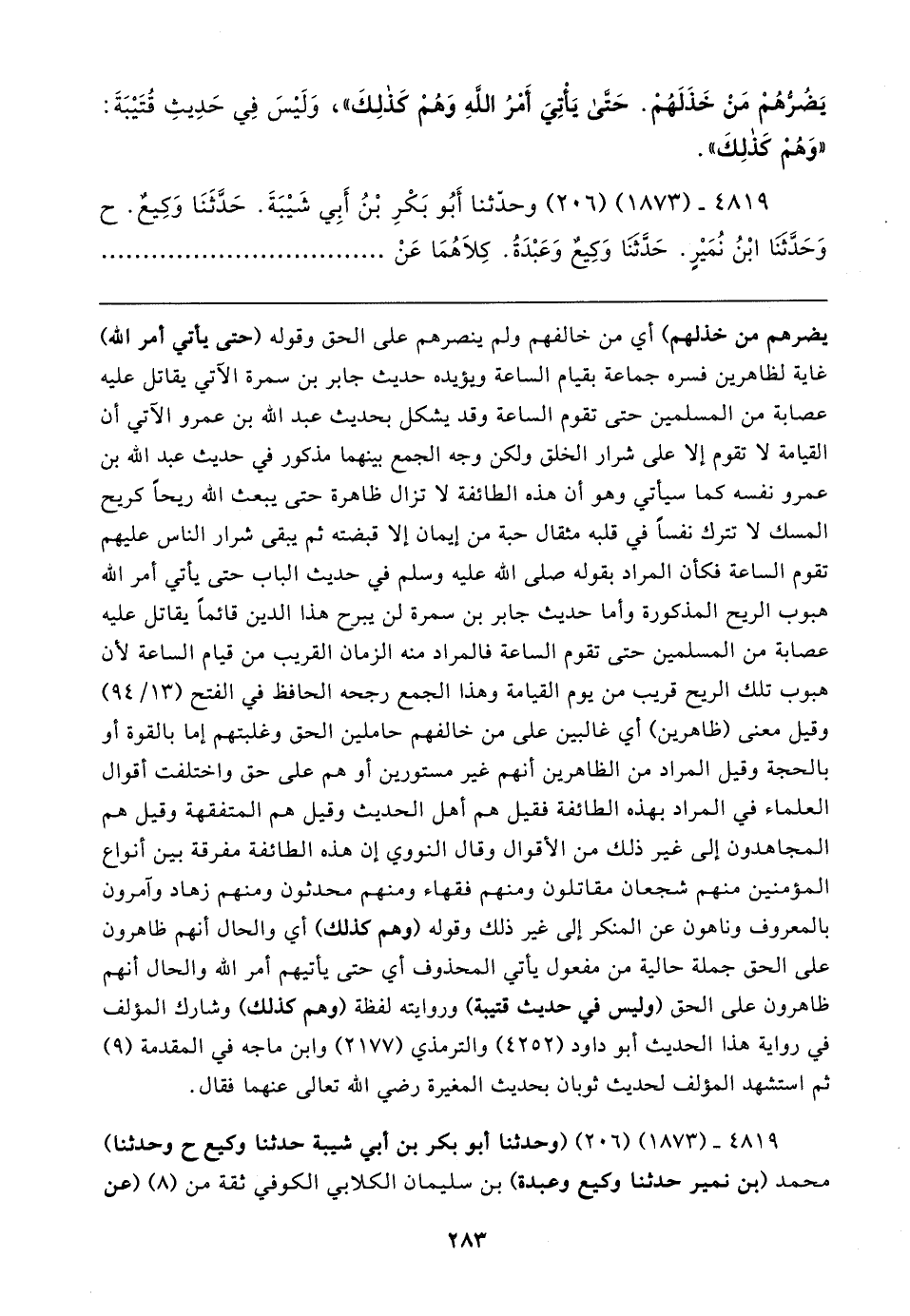 يَضُرُّهُمْ مَنْ خَذَلَهُمْ. حَتَّى يَأْتِيَ أَمْرُ اللهِ وَهُمْ كَذلِكَ"، وَلَيسَ فِي حَدِيثِ قُتَيبَةَ: "وَهُمْ كَذلِكَ".