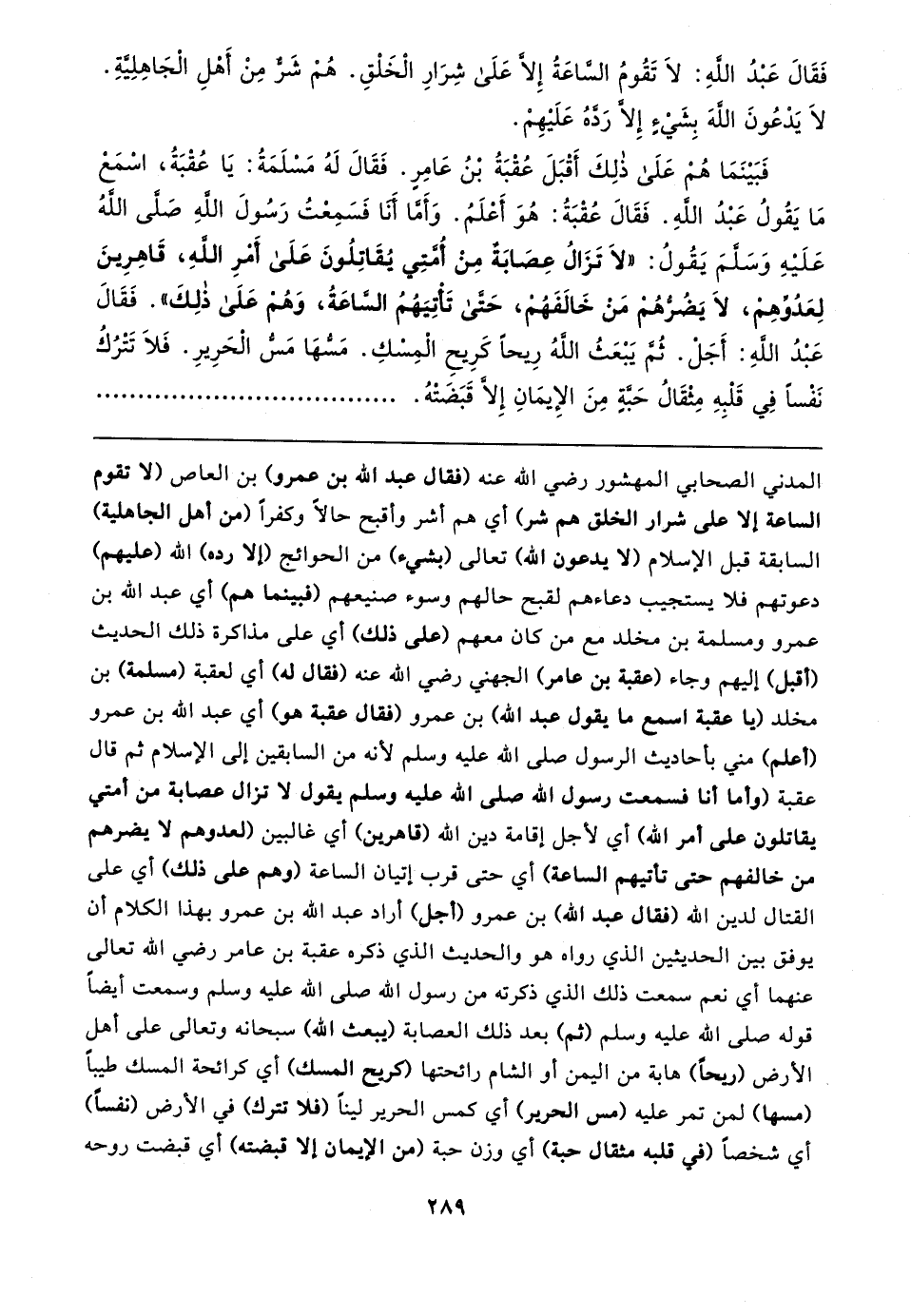 فَبَينَمَا هُمْ عَلَى ذلِكَ أَقْبَلَ عُقْبَةُ بْنُ عَامِرٍ. فَقَال لَهُ مَسْلَمَةُ: يَا عُقْبَةُ، اسْمَعْ مَا يَقُولُ عَبْدُ اللهِ. فَقَال عُقْبَةُ: هُوَ أَعْلَمُ. وَأَمَّا أَنَا فَسَمِعْتُ رَسُولَ اللهِ صَلَّى اللهُ عَلَيهِ وَسَلَّمَ يَقُولُ: "لَا تَزَالُ عِصَابَة مِنْ أُمَّتِي يُقَاتِلُونَ عَلَى أَمْرِ اللهِ، قَاهِرِينَ لِعَدُوِّهِمْ، لَا يَضُرُّهُمْ مَنْ خَالفَهُمْ، حَتَّى تَأْتِيَهُمُ السَّاعَةُ، وَهُمْ عَلَى ذلِكَ". فَقَال عَبْدُ اللهِ: أَجَلْ. ثُمَّ يَبْعَثُ اللهُ رِيحًا كَرِيحِ الْمِسْكِ. مَسُّهَا مَسُّ الْحَرِيرِ. فَلَا تَتْرُكُ نَفْسًا فِي قَلْبِهِ مِثْقَالُ حَبَّةٍ مِنَ الإِيمَانِ إلا قَبَضَتْهُ
