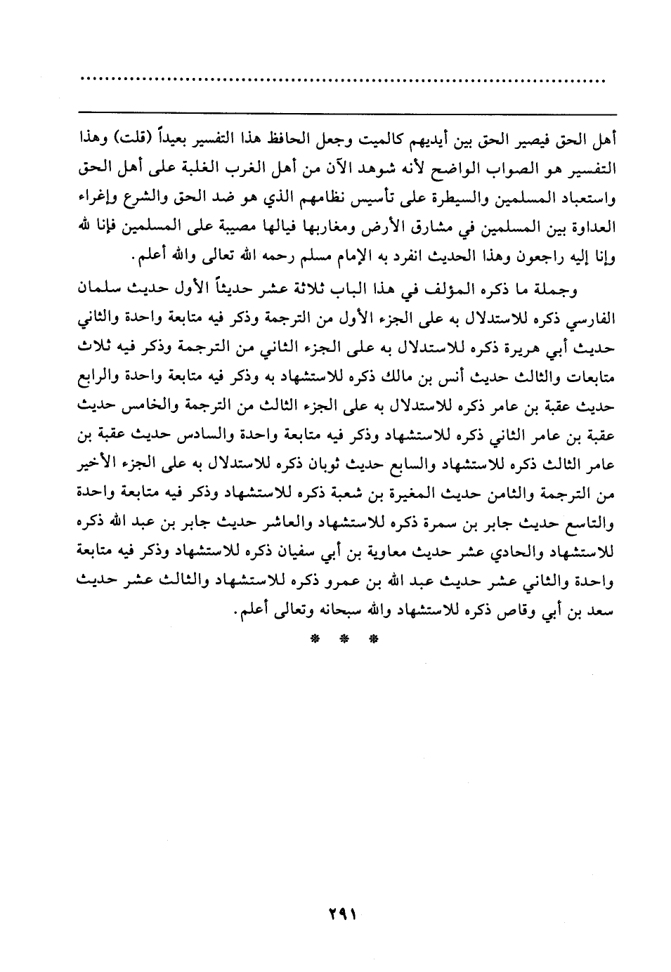 وجملة ما ذكره المؤلف في هذا الباب ثلاثة عشر حديثًا الأول حديث سلمان الفارسي ذكره للاستدلال به على الجزء الأول من الترجمة وذكر فيه متابعة واحدة والثاني حديث أبي هريرة ذكره للاستدلال به على الجزء الثاني من الترجمة وذكر فيه ثلاث متابعات والثالث حديث أنس بن مالك ذكره للاستشهاد به وذكر فيه متابعة واحدة والرابع حديث عقبة بن عامر ذكره للاستدلال به على الجزء الثالث من الترجمة والخامس حديث عقبة بن عامر الثاني ذكره للاستشهاد وذكر فيه متابعة واحدة والسادس حديث عقبة بن عامر الثالث ذكره للاستشهاد والسابع حديث ثوبان ذكره للاستدلال به على الجزء الأخير من الترجمة والثامن حديث المغيرة بن شعبة ذكره للاستشهاد وذكر فيه متابعة واحدة والتاسع حديث جابر بن سمرة ذكره للاستشهاد والعاشر حديث جابر بن عبد الله ذكره للاستشهاد والحادي عشر حديث معاوية بن أبي سفيان ذكره للاستشهاد وذكر فيه متابعة واحدة والثاني عشر حديث عبد الله بن عمرو ذكره للاستشهاد والثالث عشر حديث سعد بن أبي وقاص ذكره للاستشهاد والله سبحانه وتعالى أعلم.