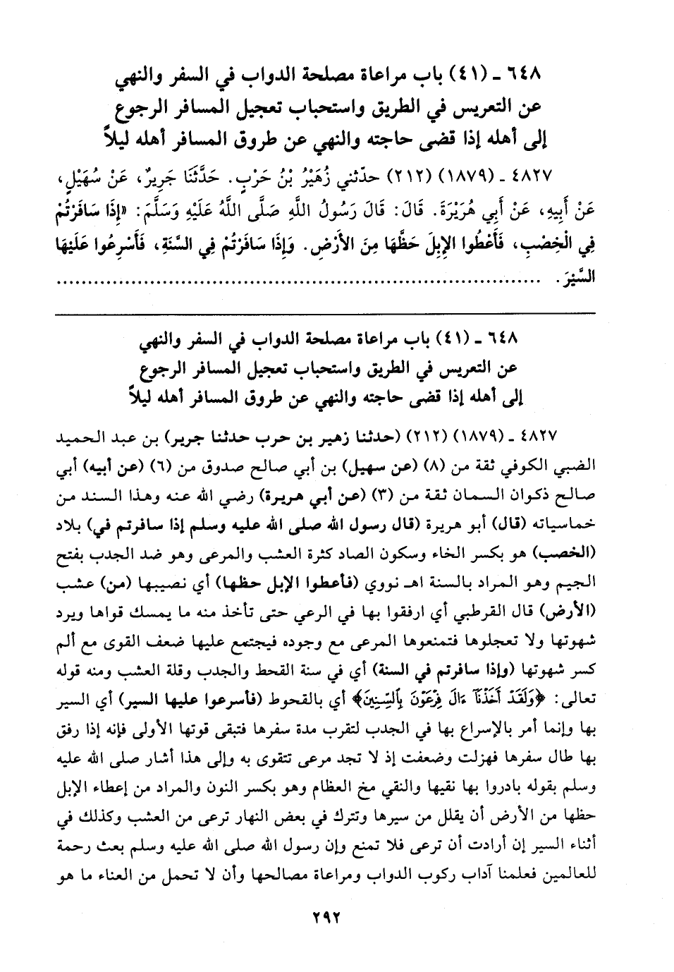٤٨٢٧ - (١٨٧٩) (٢١٢) حدّثني زُهَيرُ بْنُ حَرْبٍ. حَدَّثَنَا جَرِيرٌ، عَنْ سُهَيلٍ، عَنْ أَبِيهِ، عَنْ أبِي هُرَيرَةَ. قَال: قَال رَسولُ اللَّهِ صَلَّى اللهُ عَلَيهِ وَسَلَّمَ: "إِذَا سَافَرْتُمْ فِي الْخِصْبِ، فَأَعْطُوا الإِبِلَ حَظَّهَا مِنَ الأَرْضِ. وَإِذَا سَافَرْتُمْ فِي السَّنَةِ، فَأَسْرِعُوا عَلَيهَا السَّيرَ