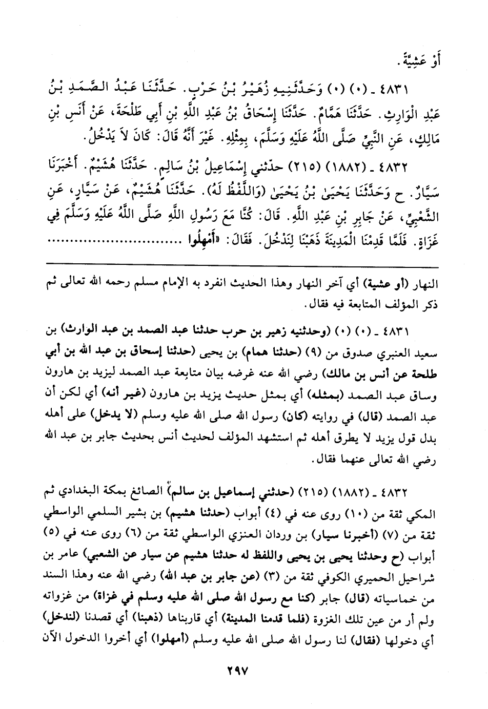٤٨٣١ - (٠) (٠) (وحدثنيه زهير بن حرب حدثنا عبد الصمد بن عبد الوارث) بن سعيد العنبري صدوق من (٩) (حدثنا همام) بن يحيى (حدثنا إسحاق بن عبد الله بن أبي طلحة عن أنس بن مالك) رضي الله عنه غرضه بيان متابعة عبد الصمد ليزيد بن هارون وساق عبد الصمد (بمثله) أي بمثل حديث يزيد بن هارون (غير أنه) أي لكن أن عبد الصمد (قال) في روايته (كان) رسول الله صلى الله عليه وسلم (لا يدخل) على أهله بدل قول يزيد لا يطرق أهله ثم استشهد المؤلف لحديث أنس بحديث جابر بن عبد الله رضي الله تعالى عنهما فقال.