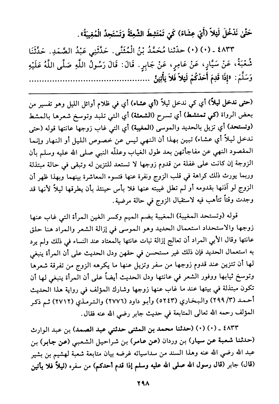 ٤٨٣٣ - (٠) (٠) حدَّثنا مُحَمَّدُ بْنُ الْمُثَنَّى. حَدَّثَنِي عَبْدُ الصَّمَدِ. حَدَّثَنَا شُعْبَةُ، عَنْ سَيَّارٍ، عَنْ عَامِرٍ، عَنْ جَابِرٍ. قَال: قَال رَسُولُ اللهِ صَلَّى اللهُ عَلَيهِ وَسَلَّمَ: "إِذَا قَدِمَ أَحَدُكُمْ لَيلًا فَلا يَأتِيَنَّ