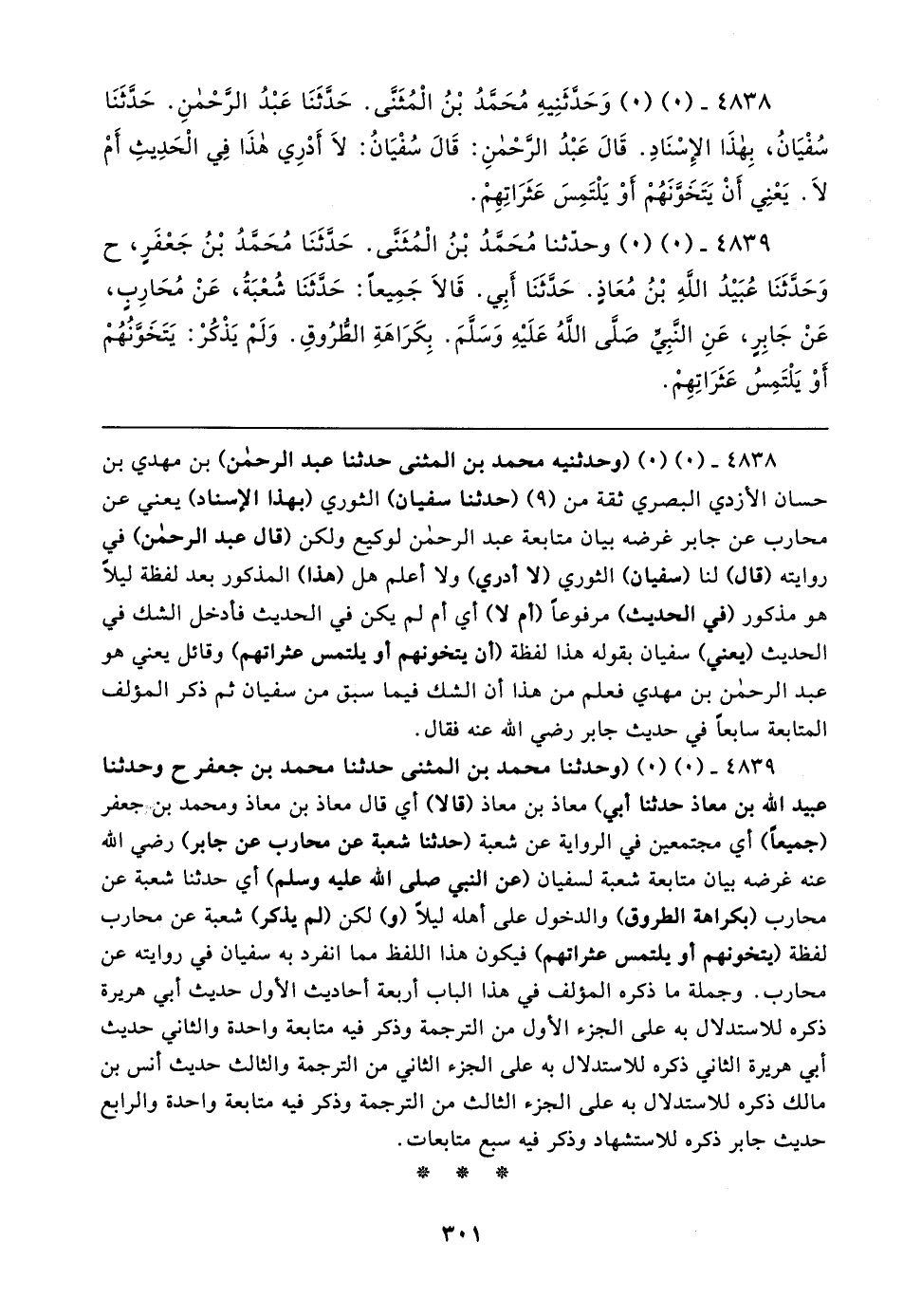٤٨٣٩ - (٠) (٠) (وحدثنا محمد بن المثنى حدثنا محمد بن جعفر ح وحدثنا عبيد الله بن معاذ حدثنا أبي) معاذ بن معاذ (قالا) أي قال معاذ بن معاذ ومحمد بن جعفر (جميعًا) أي مجتمعين في الرواية عن شعبة (حدثنا شعبة عن محارب عن جابر) رضي الله عنه غرضه بيان متابعة شعبة لسفيان (عن النبي صلى الله عليه وسلم) أي حدثنا شعبة عن محارب (بكراهة الطروق) والدخول على أهله ليلًا (و) لكن (لم يدكر) شعبة عن محارب لفظة (يتخونهم أو يلتمس عثراتهم) فيكون هذا اللفظ مما انفرد به سفيان في روايته عن محارب. وجملة ما ذكره المؤلف في هذا الباب أربعة أحاديث الأول حديث أبي هريرة ذكره للاستدلال به على الجزء الأول من الترجمة وذكر فيه متابعة واحدة والثاني حديث أبي هريرة الثاني ذكره للاستدلال به على الجزء الثاني من الترجمة والثالث حديث أنس بن مالك ذكره للاستدلال به على الجزء الثالث من الترجمة وذكر فيه متابعة واحدة والرابع حديث جابر ذكره للاستشهاد وذكر فيه سبع متابعات.