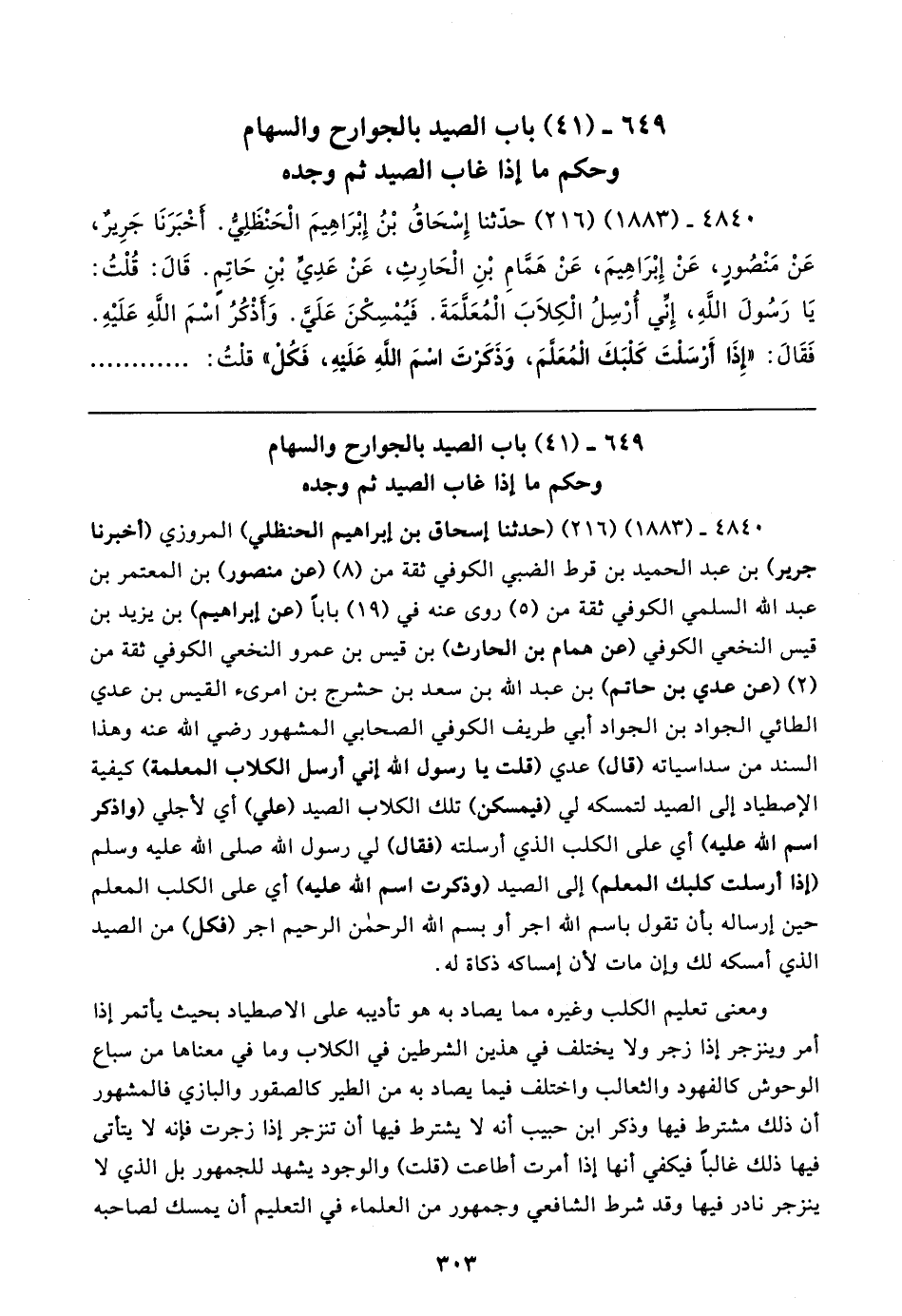 ٤٨٤٠ - (١٨٨٣) (٢١٦) (حدثنا إسحاق بن إبراهيم الحنظلي) المروزي (أخبرنا جرير) بن عبد الحميد بن قرط الضبي الكوفي ثقة من (٨) (عن منصور) بن المعتمر بن عبد الله السلمي الكوفي ثقة من (٥) روى عنه في (١٩) بابا (عن إبراهيم) بن يزيد بن قيس النخعي الكوفي (عن همام بن الحارث) بن قيس بن عمرو النخعي الكوفي ثقة من (٢) (عن عدي بن حاتم) بن عبد الله بن سعد بن حشرج بن امرئ القيس بن عدي الطائي الجواد بن الجواد أبي طريف الكوفي الصحابي المشهور رضي الله عنه وهذا السند من سداسياته (قال) عدي (قلت يا رسول الله إني أرسل الكلاب المعلمة) كيفية الإصطياد إلى الصيد لتمسكه لي (فيمسكن) تلك الكلاب الصيد (علي) أي لأجلي (واذكر اسم الله عليه) أي على الكلب الذي أرسلته (فقال) لي رسول الله صلى الله عليه وسلم (إذا أرسلت كلبك المعلم) إلى الصيد (وذكرت اسم الله عليه) أي على الكلب المعلم حين إرساله بأن تقول باسم الله اجر أو بسم الله الرحمن الرحيم اجر (فكل) من الصيد الذي أمسكه لك وإن مات لأن إمساكه ذكاة له.