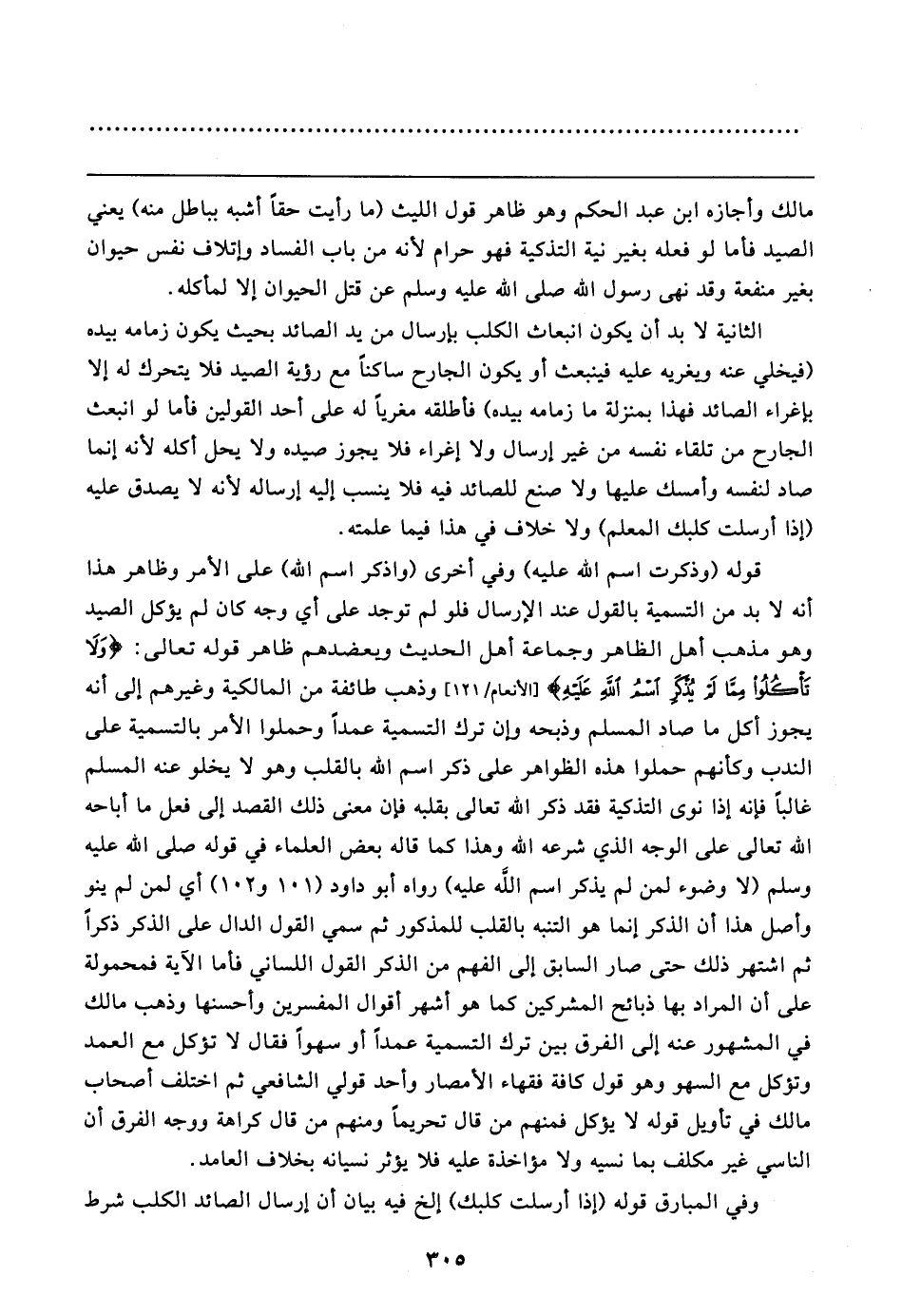 الثانية لا بد أن يكون انبعاث الكلب بإرسال من يد الصائد بحيث يكون زمامه بيده (فيخلي عنه ويغريه عليه فينبعث أو يكون الجارح ساكنًا مع رؤية الصيد فلا يتحرك له إلا بإغراء الصائد فهذا بمنزلة ما زمامه بيده) فأطلقه مغريًا له على أحد القولين فأما لو انبعث الجارح من تلقاء نفسه من غير إرسال ولا إغراء فلا يجوز صيده ولا يحل أكله لأنه إنما صاد لنفسه وأمسك عليها ولا صنع للصائد فيه فلا ينسب إليه إرساله لأنه لا يصدق عليه (إذا أرسلت كلبك المعلم) ولا خلاف في هذا فيما علمته. قوله (وذكرت اسم الله عليه) وفي أخرى (واذكر اسم الله) على الأمر وظاهر هذا أنه لا بد من التسمية بالقول عند الإرسال فلو لم توجد على أي وجه كان لم يؤكل الصيد وهو مذهب أهل الظاهر وجماعة أهل الحديث ويعضدهم ظاهر قوله تعالى: {وَلَا تَأْكُلُوا مِمَّا لَمْ يُذْكَرِ اسْمُ اللَّهِ عَلَيهِ} [الأنعام: ١٢١] وذهب طائفة من المالكية وغيرهم إلى أنه يجوز أكل ما صاد المسلم وذبحه فإن ترك التسمية عمدًا وحملوا الأمر بالتسمية على الندب وكأنهم حملوا هذه الظواهر على ذكر اسم الله بالقلب وهو لا يخلو عنه المسلم غالبًا فإنه إذا نوى التذكية فقد ذكر الله تعالى بقلبه فإن معنى ذلك القصد إلى فعل ما أباحه الله تعالى على الوجه الذي شرعه الله وهذا كما قاله بعض العلماء في قوله صلى الله عليه وسلم (لا وضوء لمن لم يذكر اسم الله عليه) رواه أبو داود (١٠١ و ١٠٢) أي لمن لم ينو وأصل هذا أن الذكر إنما هو التنبه بالقلب للمذكور ثم سمي القول الدال على الذكر ذكرًا ثم اشتهر ذلك حتى صار السابق إلى الفهم من الذكر القول اللساني فأما الآية فمحمولة على أن المراد بها ذبائح المشركين كما هو أشهر أقوال المفسرين وأحسنها وذهب مالك في المشهور عنه إلى الفرق بين ترك التسمية عمدًا أو سهوًا فقال لا تؤكل مع العمد وتؤكل مع السهو وهو قول كافة فقهاء الأمصار وأحد قولي الشافعي ثم اختلف أصحاب مالك في تأويل قوله لا يؤكل فمنهم من قال تحريمًا ومنهم من قال كراهة ووجه الفرق أن الناسي غير مكلف بما نسيه ولا مؤاخذة عليه فلا يؤثر نسيانه بخلاف العامد.