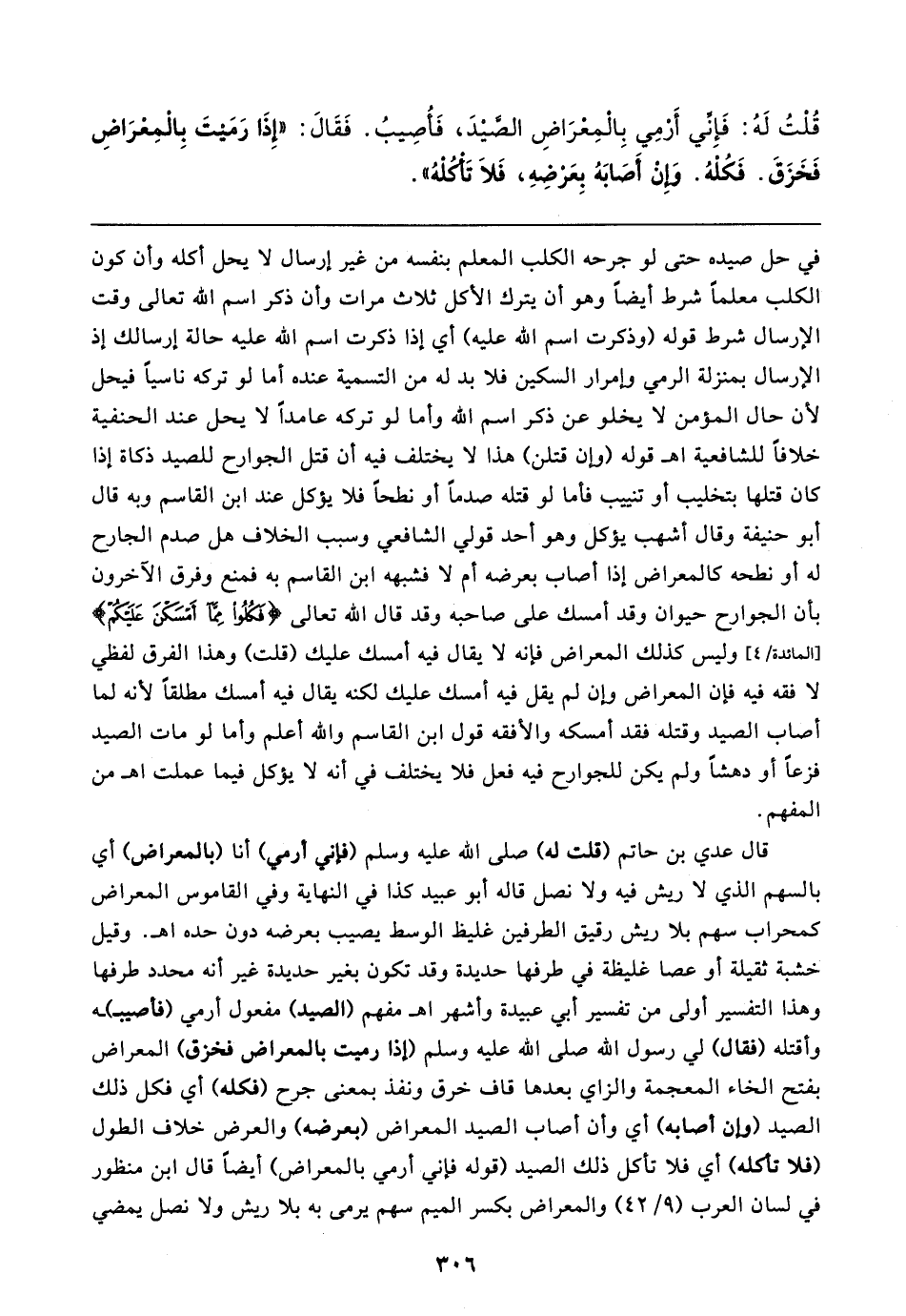 قال عدي بن حاتم (قلت له) صلى الله عليه وسلم (فإني أرمي) أنا (بالمعراض) أي بالسهم الذي لا ريش فيه ولا نصل قاله أبو عبيد كذا في النهاية وفي القاموس المعراض كمحراب سهم بلا ريش رقيق الطرفين غليظ الوسط يصيب بعرضه دون حده اهـ. وقيل خشبة ثقيلة أو عصا غليظة في طرفها حديدة وقد تكون بغير حديدة غير أنه محدد طرفها وهذا التفسير أولى من تفسير أبي عبيدة وأشهر اهـ مفهم (الصيد) مفعول أرمي (فأصيبـ) ـه وأقتله (فقال) لي رسول الله صلى الله عليه وسلم (إذا رميت بالمعراض فخزق) المعراض بفتح الخاء المعجمة والزاي بعدها قاف خرق ونفذ بمعنى جرح (فكله) أي فكل ذلك الصيد (وإن أصابه) أي وأن أصاب الصيد المعراض (بعرضه) والعرض خلاف الطول (فلا تأكله) أي فلا تأكل ذلك الصيد (قوله فإني أرمي بالمعراض) أيضًا قال ابن منظور في لسان العرب (٩/ ٤٢) والمعراض بكسر الميم سهم يرمى به بلا ريش ولا نصل يمضي