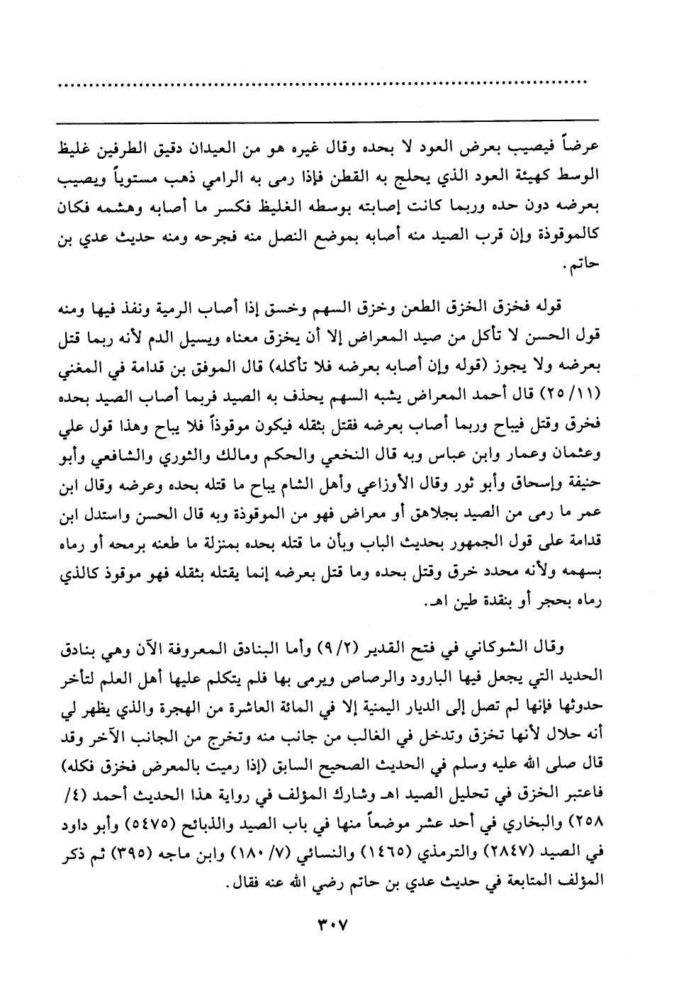 وقال الشوكاني في فتح القدير (٢/ ٩) وأما البنادق المعروفة الآن وهي بنادق الحديد التي يجعل فيها البارود والرصاص ويرمى بها فلم يتكلم عليها أهل العلم لتأخر حدوثها فإنها لم تصل إلى الديار اليمنية إلا في المائة العاشرة من الهجرة والذي يظهر لي أنه حلال لأنها تخزق وتدخل في الغالب من جانب منه وتخرج من الجانب الآخر وقد قال صلى الله عليه وسلم في الحديث الصحيح السابق (إذا رميت بالمعرض فخزق فكله) فاعتبر الخزق في تحليل الصيد اهـ وشارك المؤلف في رواية هذا الحديث أحمد (٤/ ٢٥٨) والبخاري في أحد عشر موضعًا منها في باب الصيد والذبائح (٥٤٧٥) وأبو داود في الصيد (٢٨٤٧) والترمذي (١٤٦٥) والنسائي (٧/ ١٨٠) وابن ماجه (٣٩٥) ثم ذكر المؤلف المتابعة في حديث عدي بن حاتم رضي الله عنه فقال.