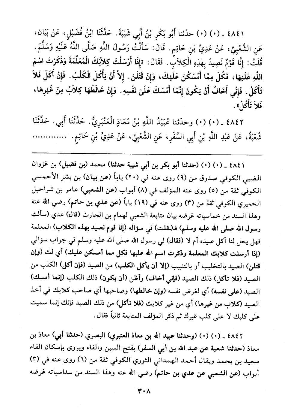 ٤٨٤١ - (٠) (٠) (حدثنا أبو بكر بن أبي شيبة حدثنا) محمد (بن فضيل) بن غزوان الضبي الكوفي صدوق من (٩) روى عنه في (٢٠) بابا (عن بيان) بن بشر الأحمسي الكوفي ثقة من (٥) روى عنه المؤلف في (٨) أبواب (عن الشعبي) عامر بن شراحيل الحميري الكوفي ثقة من (٣) روى عنه في (١٩) بابا (عن عدي بن حاتم) رضي الله عنه وهذا السند من خماسياته غرضه بيان متابعة الشعبي لهمام بن الحارث (قال) عدي (سألت رسول الله صلى الله عليه وسلم) فـ (ـقلت) في سؤاله (إنا قوم نصيد بهذه الكلاب) المعلمة فهل يحل لنا أكل صيده أم لا (فقال) لي رسول الله صلى الله عليه وسلم في جواب سؤالي (إذا أرسلت كلابك المعلمة وذكرت اسم الله عليها فكل مما أمسكن عليك) أي لك (وإن قتلن) الصيد بالتخليب أو بالتنبيب (إلا أن يأكل الكلب) من الصيد (فإن أكل) الكلب من الصيد (فلا تأكل) ذلك الصيد (فإني أخاف) وأظن (أن يكون) ذلك الكلب (إنما أمسك) الصيد (على نفسه) أي لغرض نفسه (وإن خالطها) وصاحبها أي صاحب كلابك في أخذ الصيد (كلاب من غيرها) أي من غير كلابك (فلا تأكل) من ذلك الصيد فإنك إنما سميت على كلبك لا على كلب غيرك ثم ذكر المؤلف المتابعة ثانيًا فقال.