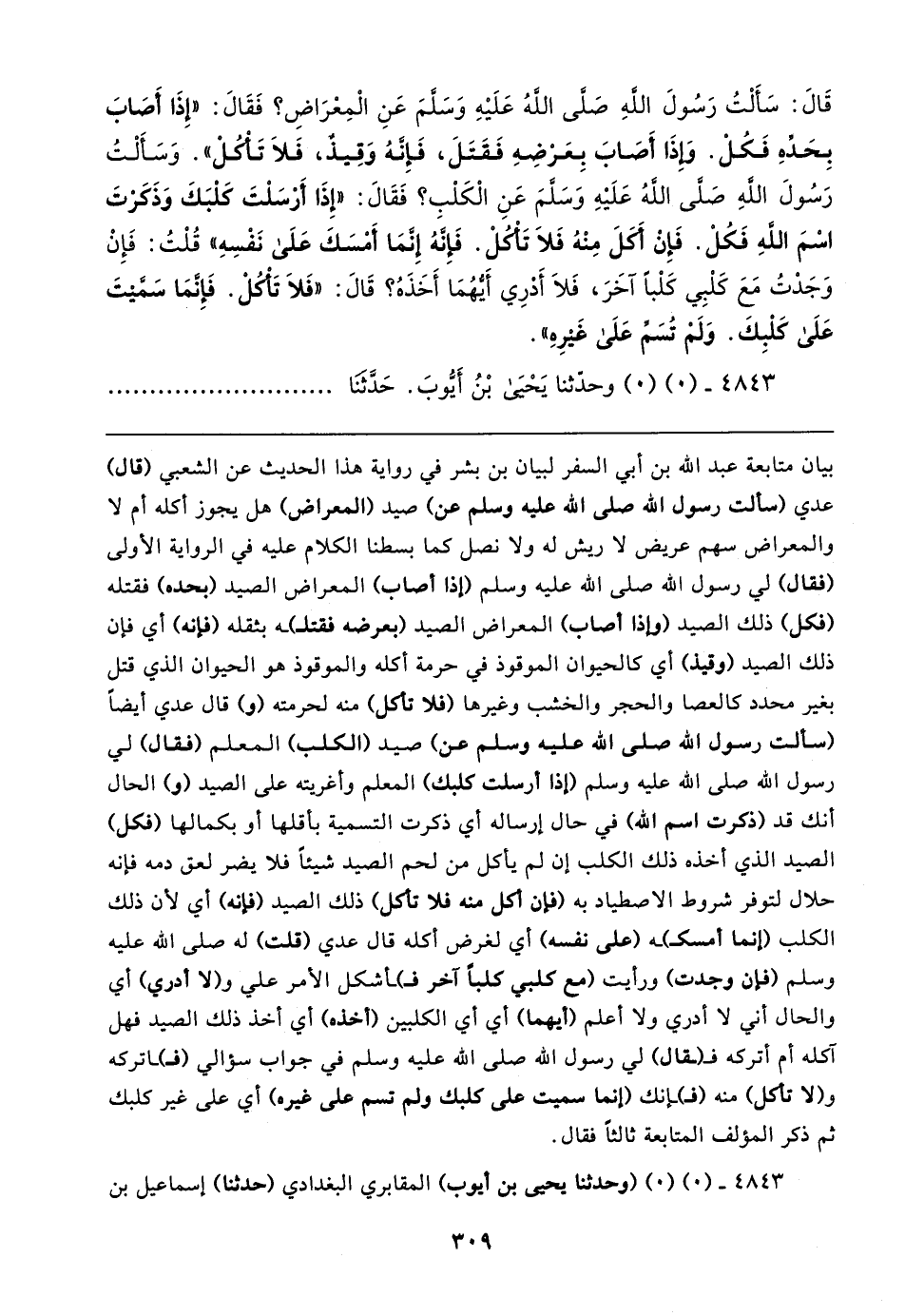 بيان متابعة عبد الله بن أبي السفر لبيان بن بشر في رواية هذا الحديث عن الشعبي (قال) عدي (سألت رسول الله صلى الله عليه وسلم عن) صيد (المعراض) هل يجوز أكله أم لا والمعراض سهم عريض لا ريش له ولا نصل كما بسطنا الكلام عليه في الرواية الأولى (فقال) لي رسول الله صلى الله عليه وسلم (إذا أصاب) المعراض الصيد (بحده) فقتله (فكل) ذلك الصيد (وإذا أصاب) المعراض الصيد (بعرضه فقتلـ) ـه بثقله (فإنه) أي فإن ذلك الصيد (وقيذ) أي كالحيوان الموقوذ في حرمة أكله والموقوذ هو الحيوان الذي قتل بغير محدد كالعصا والحجر والخشب وغيرها (فلا تأكل) منه لحرمته (و) قال عدي أيضًا (سألت رسول الله صلى الله عليه وسلم عن) صيد (الكلب) المعلم (فقال) لي رسول الله صلى الله عليه وسلم (إذا أرسلت كلبك) المعلم وأغريته على الصيد (و) الحال أنك قد (ذكرت اسم الله) في حال إرساله أي ذكرت التسمية بأقلها أو بكمالها (فكل) الصيد الذي أخذه ذلك الكلب إن لم يأكل من لحم الصيد شيئًا فلا يضر لعق دمه فإنه حلال لتوفر شروط الاصطياد به (فإن أكل منه فلا تأكل) ذلك الصيد (فإنه) أي لأن ذلك الكلب (إنما أمسكـ) ـه (على نفسه) أي لغرض أكله قال عدي (قلت) له صلى الله عليه وسلم (فإن وجدت) ورأيت (مع كلبي كلبًا آخر فـ) ـأشكل الأمر علي و (لا أدري) أي والحال أني لا أدري ولا أعلم (أيهما) أي أي الكلبين (أخذه) أي أخذ ذلك الصيد فهل آكله أم أتركه فـ (ـقال) لي رسول الله صلى الله عليه وسلم في جواب سؤالي (فـ) ـاتركه و (لا تأكل) منه (فـ) ـإنك (إنما سميت على كلبك ولم تسم على غيره) أي على غير كلبك ثم ذكر المؤلف المتابعة ثالثًا فقال.