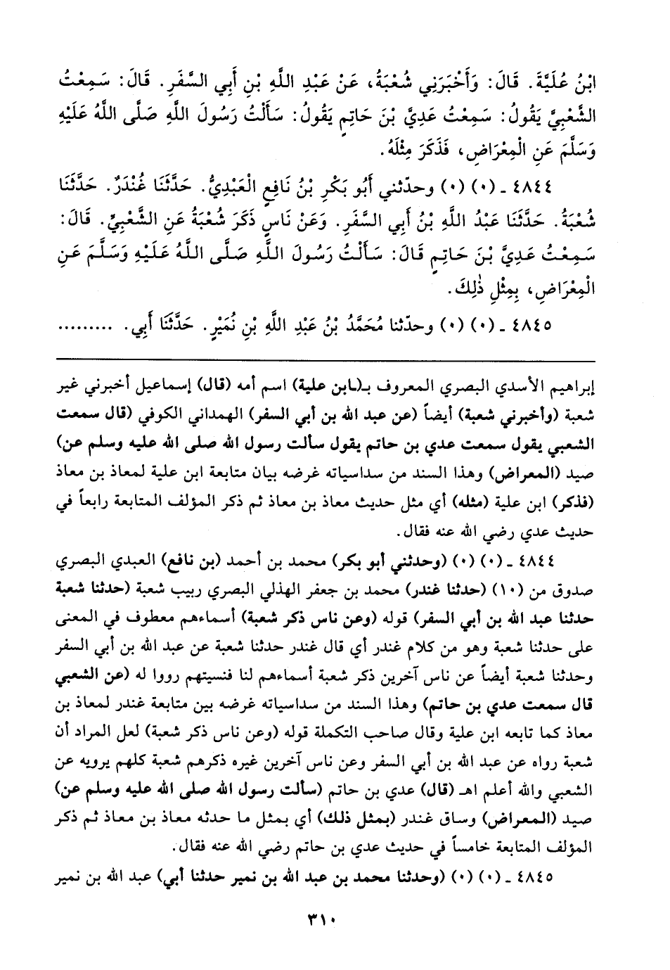 ابْنُ عُلَيَّةَ. قَال: وَأَخبَرَنِي شُعْبَةُ، عَن عَبْدِ اللهِ بْنِ أَبِي السَّفَرِ. قَال: سَمِعْتُ الشَّعْبِيِّ يَقُولُ: سَمِعْتُ عَدِيَّ بْنَ حَاتِمٍ يَقُولُ: سَأَلْتُ رَسُولَ اللهِ صَلَّى اللهُ عَلَيهِ وَسَلَّمَ عَنِ المِعْرَاضِ، فَذَكَرَ مِثلَهُ.