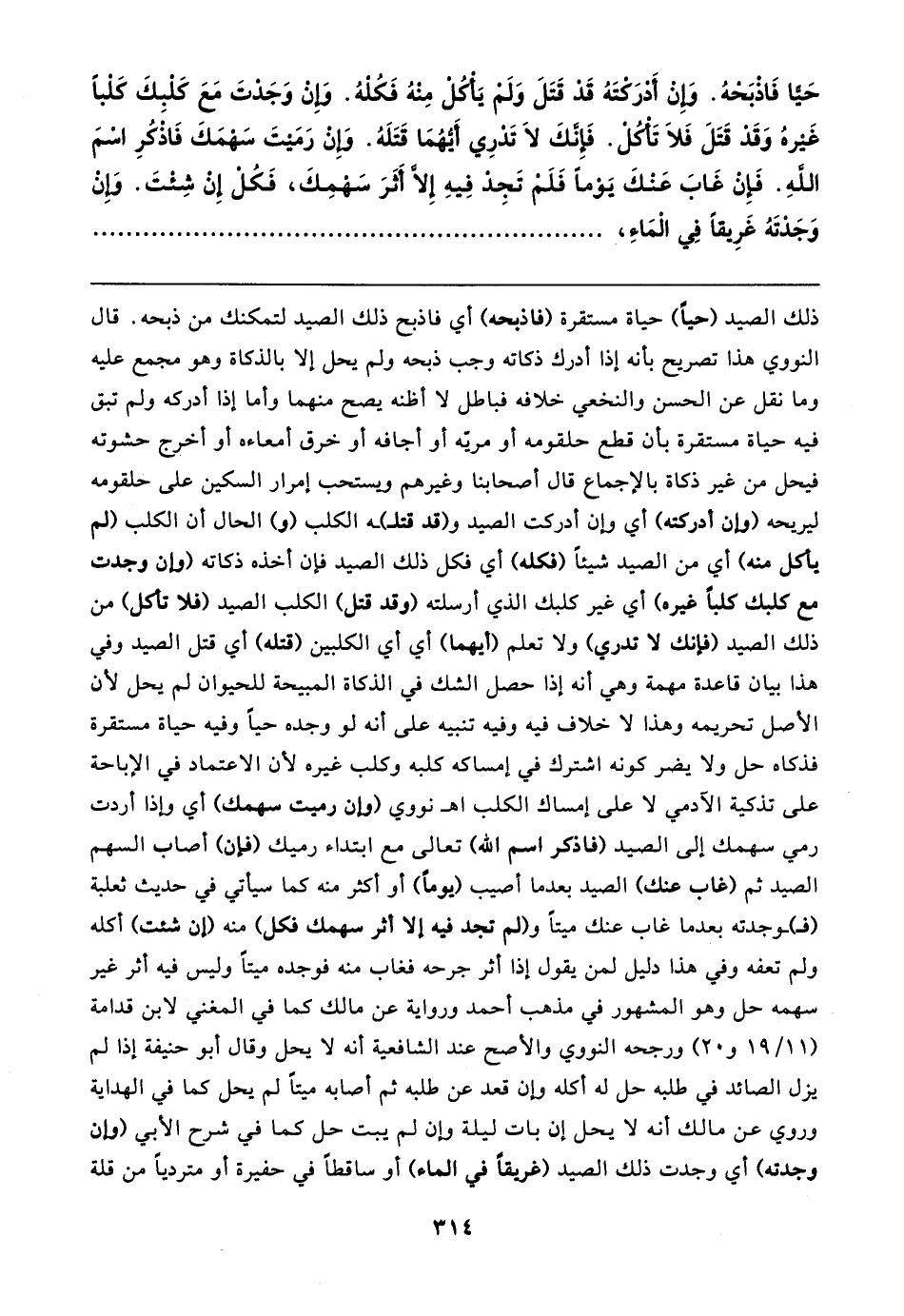 حَيًّا فَاذْبَحْهُ. وَإِنْ أَدْرَكتَهُ قَدْ قَتَلَ وَلَمْ يَأْكُلْ مِنْهُ فَكُلْهُ. وَإِنْ وَجَدْتَ مَعَ كَلْبِكَ كَلْبًا غَيرهُ وَقَدْ قَتَلَ فَلَا تَأْكُلْ. فَإنَّكَ لَا تَدْرِي أَيُّهُمَا قَتَلَهُ. وَإنْ رَمَيتَ سَهْمَكَ فَاذكُرِ اسْمَ اللهِ. فَإِنْ غَابَ عَنْكَ يَوْمًا فَلَمْ تَجِد فِيهِ إلَّا أَثَرَ سَهْمِكَ، فَكُلْ إِنْ شِئْتَ. وَإِنْ وَجَدْتَهُ غَرِيقًا فِي الْمَاءِ،