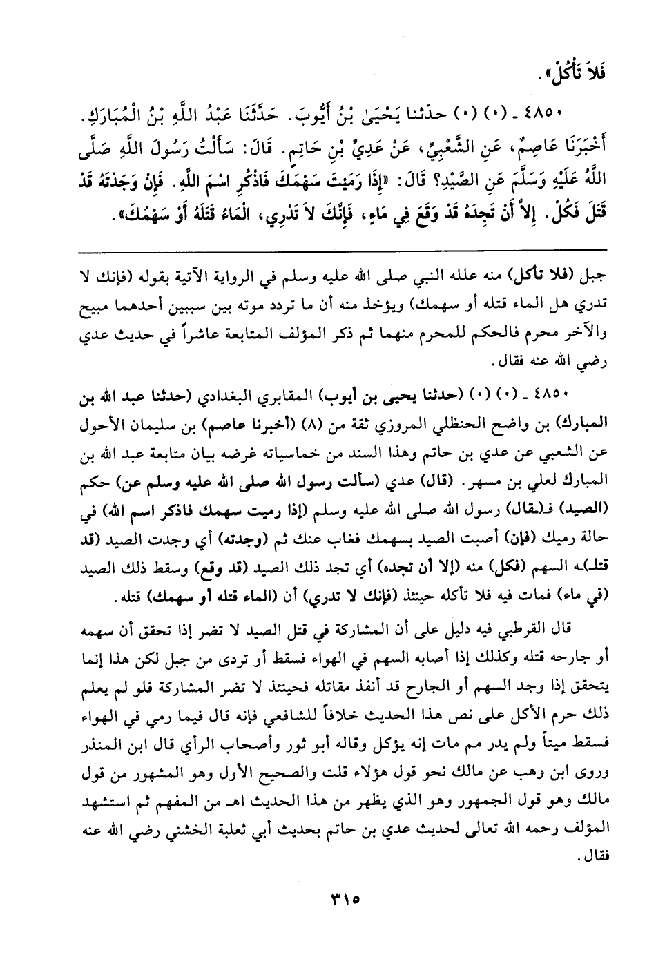 ٤٨٥٠ - (٠) (٠) (حدثنا يحيى بن أيوب) المقابري البغدادي (حدثنا عبد الله بن المبارك) بن واضح الحنظلي المروزي ثقة من (٨) (أخبرنا عاصم) بن سليمان الأحول عن الشعبي عن عدي بن حاتم وهذا السند من خماسياته غرضه بيان متابعة عبد الله بن المبارك لعلي بن مسهر. (قال) عدي (سألت رسول الله صلى الله عليه وسلم عن) حكم (الصيد) فـ (ـقال) رسول الله صلى الله عليه وسلم (إذا رميت سهمك فاذكر اسم الله) في حالة رميك (فإن) أصبت الصيد بسهمك فغاب عنك ثم (وجدته) أي وجدت الصيد (قد قتلـ) ـه السهم (فكل) منه (إلا أن تجده) أي تجد ذلك الصيد (قد وقع) وسقط ذلك الصيد (في ماء) فمات فيه فلا تأكله حينئذ (فإنك لا تدري) أن (الماء قتله أو سهمك) قتله.