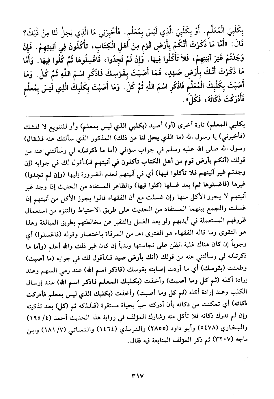 بِكَلْبِيَ الْمُعَلَّمِ. أَوْ بِكَلْبِيَ الَّذِي لَيسَ بِمُعَلَّم. فَأَخْبِرْنِي مَا الَّذِي يَحِل لَنَا مِنْ ذلِكَ؟ قَال: "أمَّا مَا ذَكَرْتَ أنَّكُمْ بأَرْضِ قَوْمٍ مِنْ أَهْلِ الْكِتَابِ، تأْكُلُونَ فِي آنِيَتِهِمْ. فَإِنْ وَجَدْتُمْ غَيرَ آنِيَتِهِمْ، فَلَا تَأْكُلُوا فِيهَا. وَإِنْ لَمْ تَجِدُوا، فَاغْسِلُوهَا ثُمَّ كُلُوا فِيهَا. وَأَمَّا مَا ذَكَرْتَ أنَّكَ بِأَرْضِ صَيدٍ، فَمَا أَصَبْتَ بِقَوْسِكَ فَاذْكُرِ اسْمَ اللهِ ثُمَّ كُلْ. وَمَا أَصَبْتَ بِكَلْبِكَ الْمُعَلَّمِ فَاذْكُرِ اسْمَ اللهِ ثُمَّ كُل. وَمَا أَصَبْتَ بكَلْبكَ الَّذِي لَيسَ بِمُعلَّمٍ فَأَدْرَكْتَ ذَكَاتَهُ، فَكُلْ"