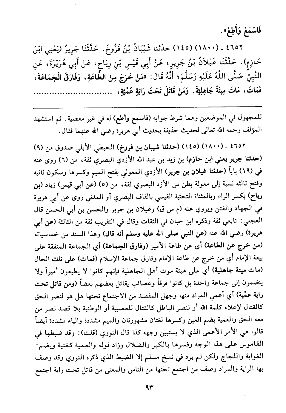 ٤٦٥٢ - (١٨٠٠) (١٤٥) حدَّثنا شَيبَانُ بْنُ فَرُّوخَ. حَدَّثَنَا جَرِيرٌ (يَعْنِي ابْنَ حَازِمٍ). حَدَّثَنَا غَيلانُ بْنُ جَرِيرٍ، عَنْ أَبِي قَيسِ بْنِ رِيَاحٍ، عَنْ أَبِي هُرَيرَةَ، عَنِ النَّبِيِّ صَلَّى القَهُ عَلَيهِ وَسَلَّمَ؛ أَنَّهُ قَال: "مَنْ خَرَجَ مِنَ الطاعَةِ، وَفَارَقَ الْجَمَاعَةَ، فَمَاتَ، مَاتَ مِيتَةً جَاهِلِيَّةً. وَمَنْ قَاتَلَ تَحْتَ رَايَةٍ عُمِّيَّةٍ،